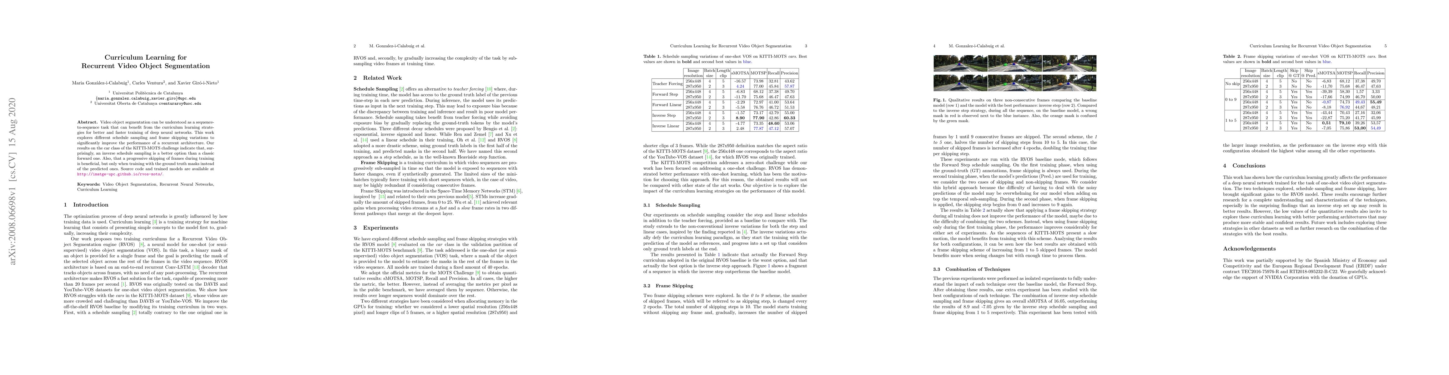 This research explores curriculum learning strategies for recurrent video object segmentation, focusing on schedule sampling and frame skipping variations to enhance training of deep neural networks. Experiments are conducted on the car class of the KITTI-MOTS challenge using an RVOS model.