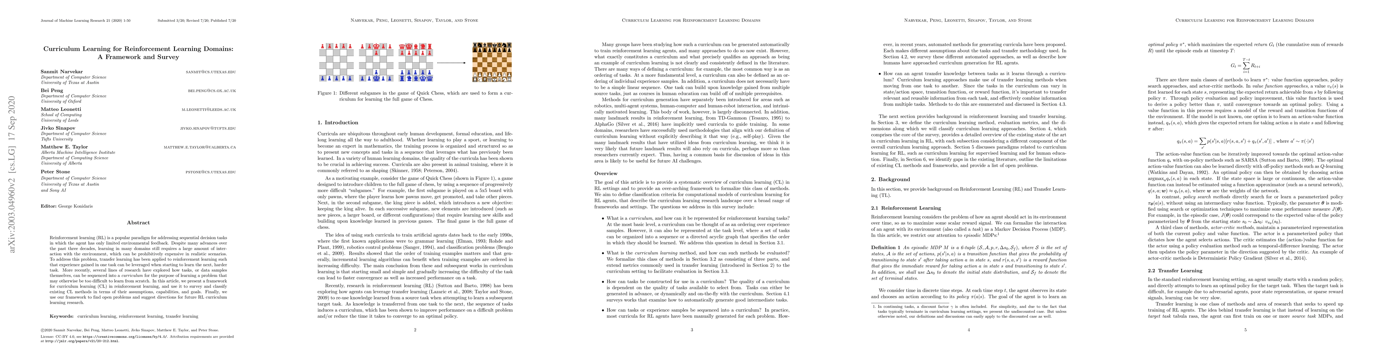 This paper presents a framework for curriculum learning in reinforcement learning and surveys existing methods, classifying them by assumptions and goals. It identifies open problems and suggests future research directions to reduce the need for extensive environment interaction.