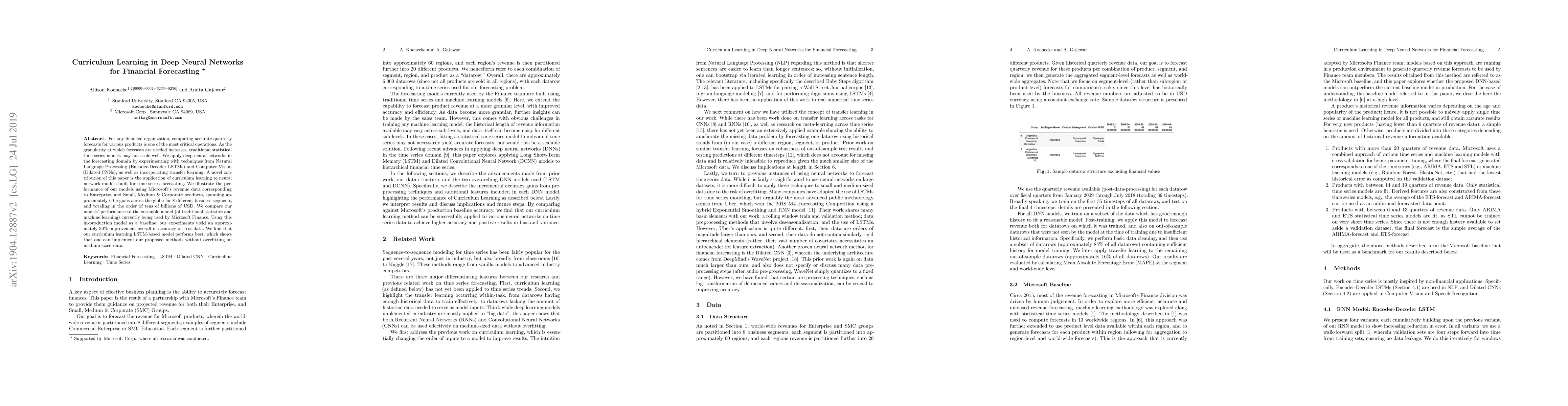 This paper explores deep neural networks for financial forecasting, applying curriculum learning to improve accuracy. The LSTM-based model with curriculum learning shows a 30% improvement over traditional methods, demonstrating effective scalability and performance on large datasets.