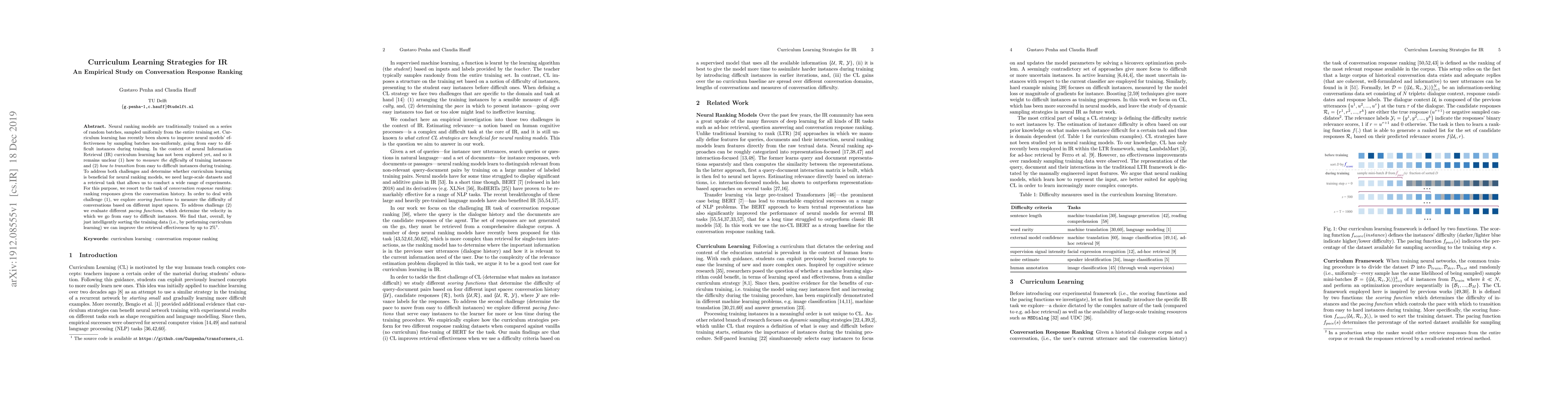 This paper investigates the application of curriculum learning strategies to neural Information Retrieval (IR) models, specifically for conversation response ranking. The study explores various methods to measure the difficulty of training instances and pacing functions to transition from easy to difficult instances, finding that curriculum learning can enhance retrieval effectiveness by up to 2%.