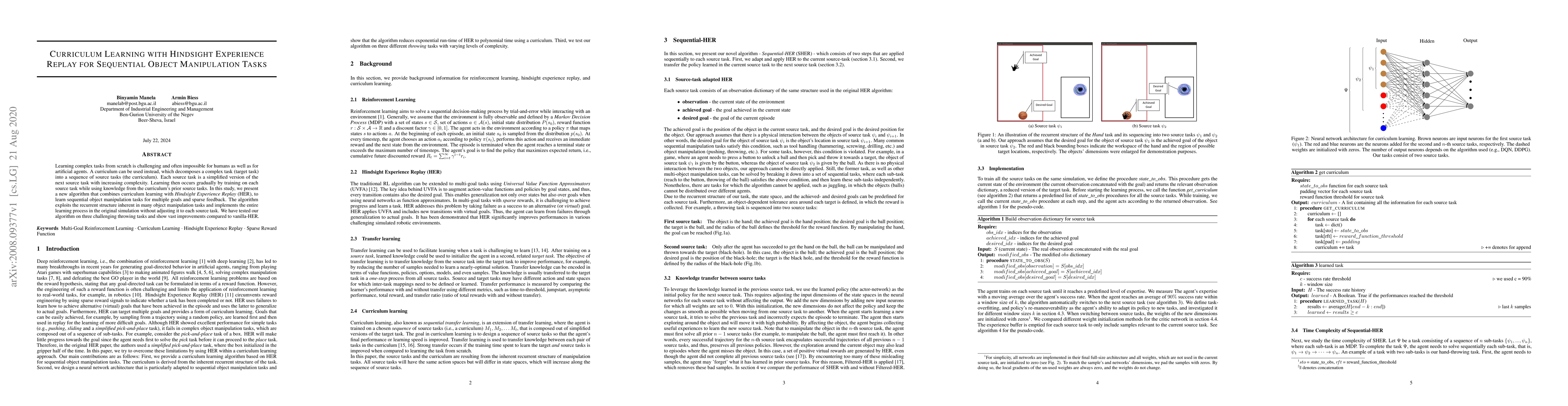 This paper introduces a novel algorithm that combines curriculum learning with Hindsight Experience Replay (HER) to efficiently learn sequential object manipulation tasks, achieving significant improvements over traditional HER on complex throwing tasks. The method leverages the inherent recurrent structure of manipulation tasks without requiring simulation adjustments.