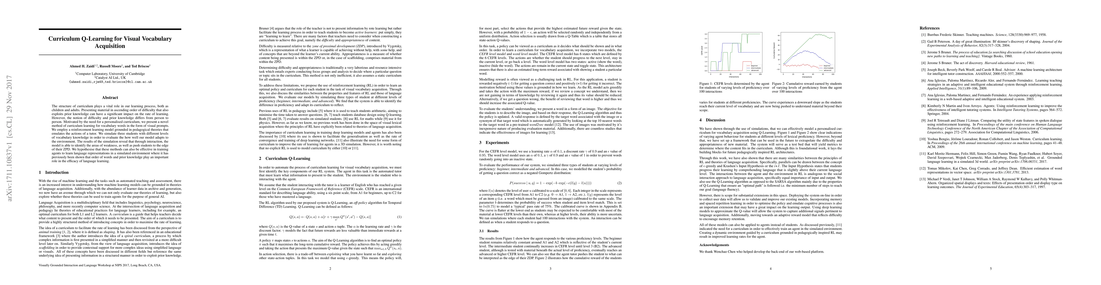 This paper proposes a curriculum learning method using Q-learning for visual vocabulary acquisition, tailored to individual students' knowledge levels. Simulation results show the model adapts well, identifies weaknesses, and pushes students to their zone of proximal development, suggesting potential for effective language learning agents.
