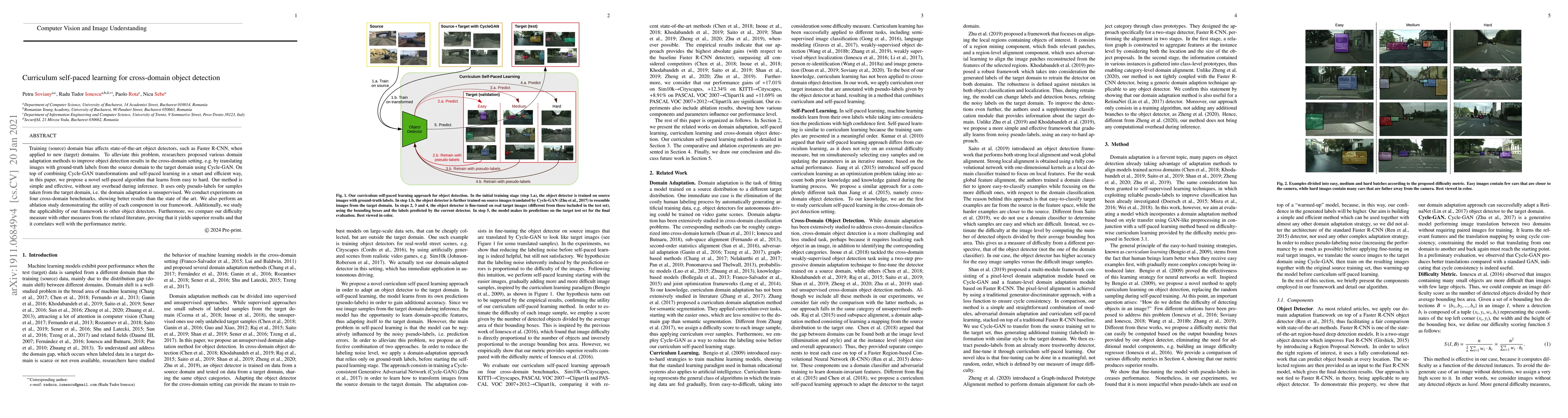 This paper proposes a novel self-paced learning algorithm for cross-domain object detection that trains from easy to hard examples, improving detection results without inference overhead. Experiments show superior performance on four benchmarks compared to state-of-the-art methods.