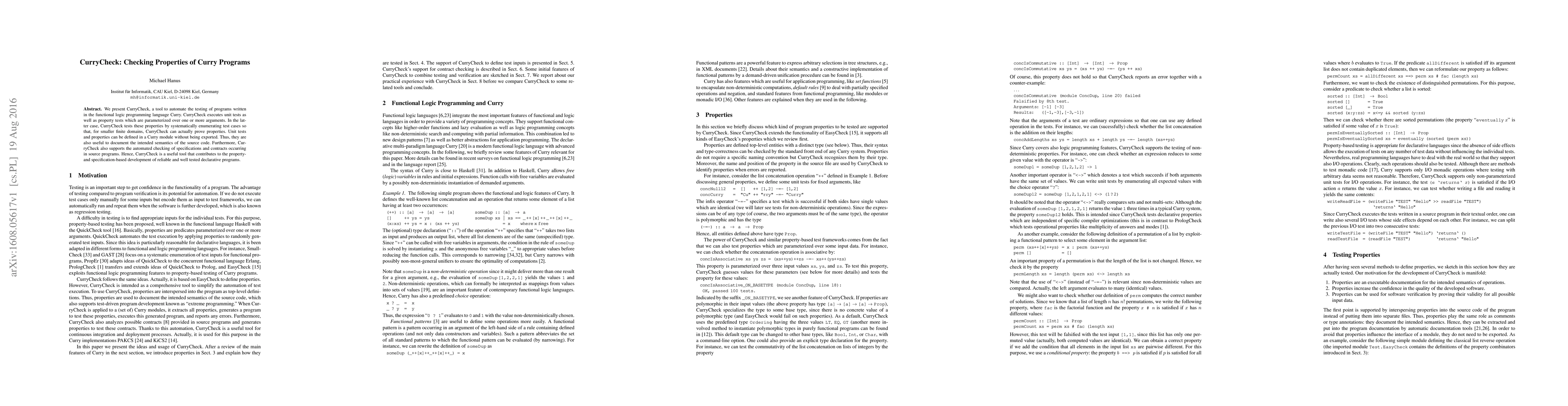 CurryCheck automates the testing of Curry programs through unit and property tests, systematically enumerating test cases to prove properties for smaller finite domains. It also supports the automated checking of specifications and contracts, aiding in the development of reliable and well-tested declarative programs.