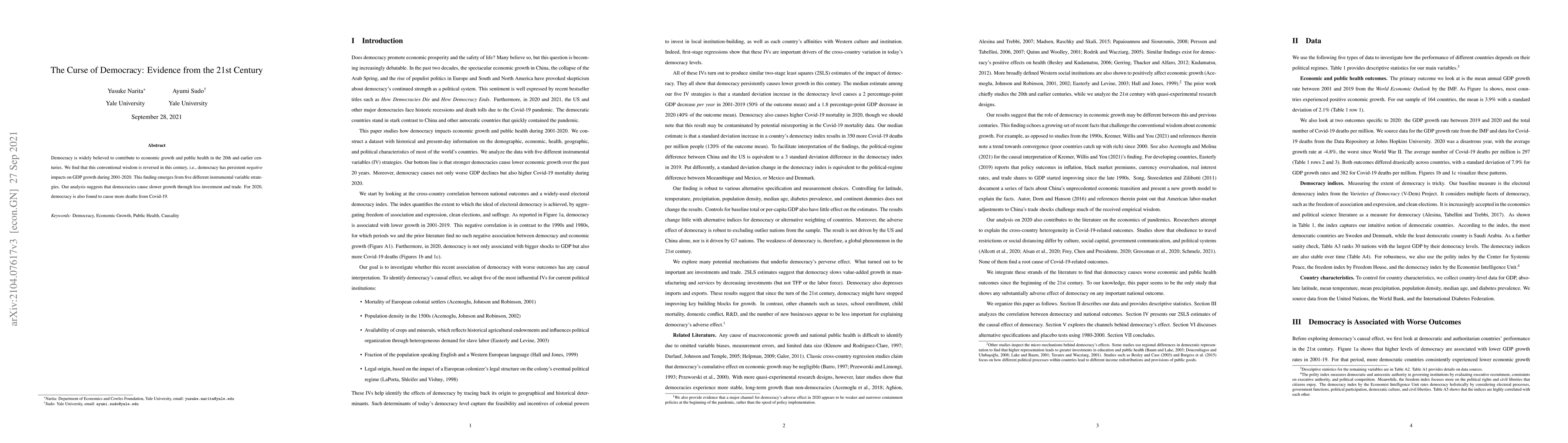 A new study finds that democracy has negative impacts on GDP growth since 2001, causing slower economic growth through reduced investment and trade. Democracy is also linked to higher mortality rates from COVID-19 in 2020.