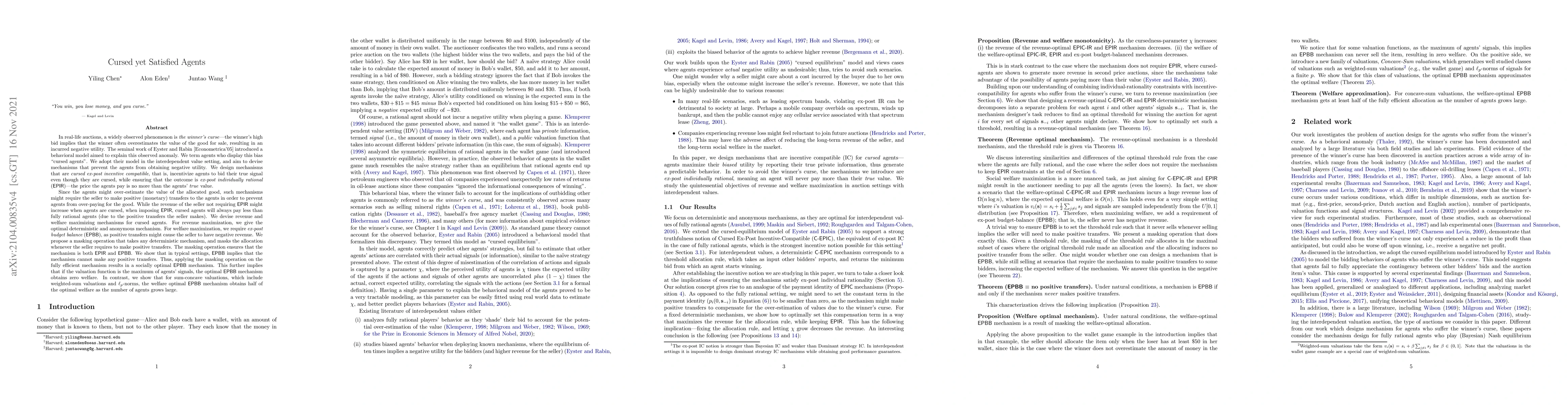 In real life auctions, a widely observed phenomenon is the winner's curse -- the winner's high bid implies that the winner often over-estimates the value of the good for sale, resulting in an incurred negative utility. The seminal work of Eyster and Rabin [Econometrica'05] introduced a behavioral model aimed to explain this observed anomaly. We term agents who display this bias "cursed agents". We adopt their model in the interdependent value setting, and aim to devise mechanisms that prevent the cursed agents from obtaining negative utility. We design mechanisms that are cursed ex-post IC, that is, incentivize agents to bid their true signal even though they are cursed, while ensuring that the outcome is individually rational -- the price the agents pay is no more than the agents' true value. Since the agents might over-estimate the good's value, such mechanisms might require the seller to make positive transfers to the agents to prevent agents from over-paying. For revenue maximization, we give the optimal deterministic and anonymous mechanism. For welfare maximization, we require ex-post budget balance (EPBB), as positive transfers might lead to negative revenue. We propose a masking operation that takes any deterministic mechanism, and imposes that the seller would not make positive transfers, enforcing EPBB. We show that in typical settings, EPBB implies that the mechanism cannot make any positive transfers, implying that applying the masking operation on the fully efficient mechanism results in a socially optimal EPBB mechanism. This further implies that if the valuation function is the maximum of agents' signals, the optimal EPBB mechanism obtains zero welfare. In contrast, we show that for sum-concave valuations, which include weighted-sum valuations and l_p-norms, the welfare optimal EPBB mechanism obtains half of the optimal welfare as the number of agents grows large.