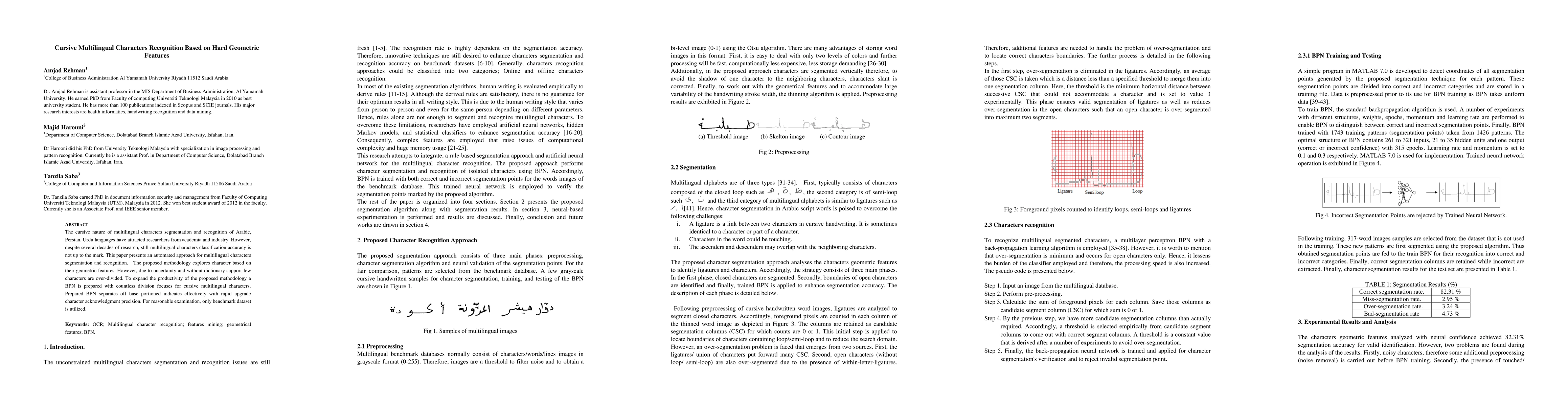 The cursive nature of multilingual characters segmentation and recognition of Arabic, Persian, Urdu languages have attracted researchers from academia and industry. However, despite several decades of research, still multilingual characters classification accuracy is not up to the mark. This paper presents an automated approach for multilingual characters segmentation and recognition. The proposed methodology explores character based on their geometric features. However, due to uncertainty and without dictionary support few characters are over-divided. To expand the productivity of the proposed methodology a BPN is prepared with countless division focuses for cursive multilingual characters. Prepared BPN separates off base portioned indicates effectively with rapid upgrade character acknowledgment precision. For reasonable examination, only benchmark dataset is utilized.