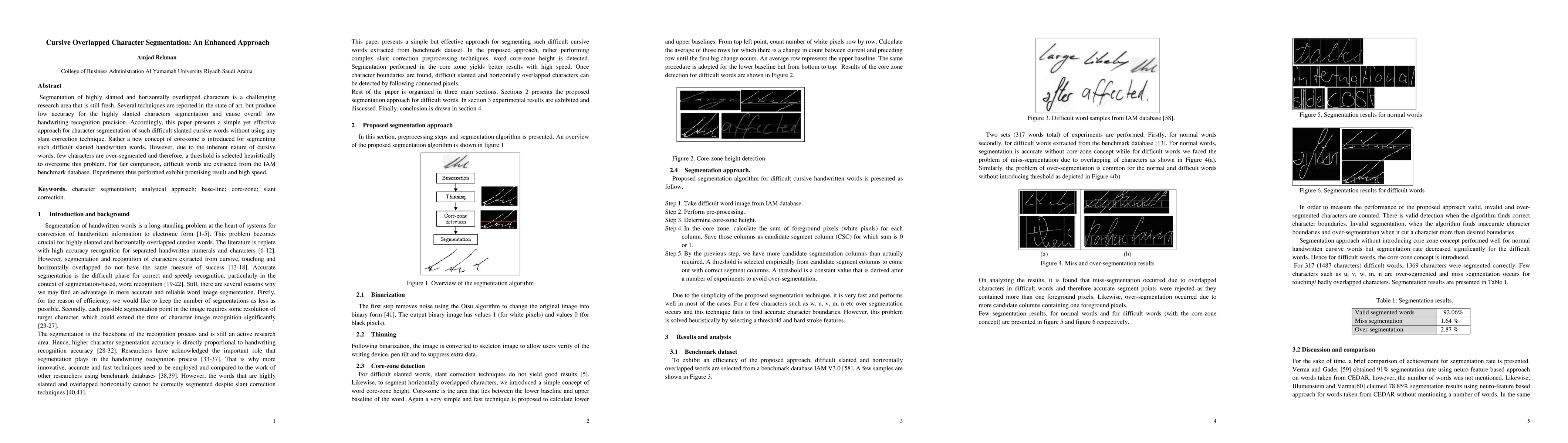 Segmentation of highly slanted and horizontally overlapped characters is a challenging research area that is still fresh. Several techniques are reported in the state of art, but produce low accuracy for the highly slanted characters segmentation and cause overall low handwriting recognition precision. Accordingly, this paper presents a simple yet effective approach for character segmentation of such difficult slanted cursive words without using any slant correction technique. Rather a new concept of core-zone is introduced for segmenting such difficult slanted handwritten words. However, due to the inherent nature of cursive words, few characters are over-segmented and therefore, a threshold is selected heuristically to overcome this problem. For fair comparison, difficult words are extracted from the IAM benchmark database. Experiments thus performed exhibit promising result and high speed.