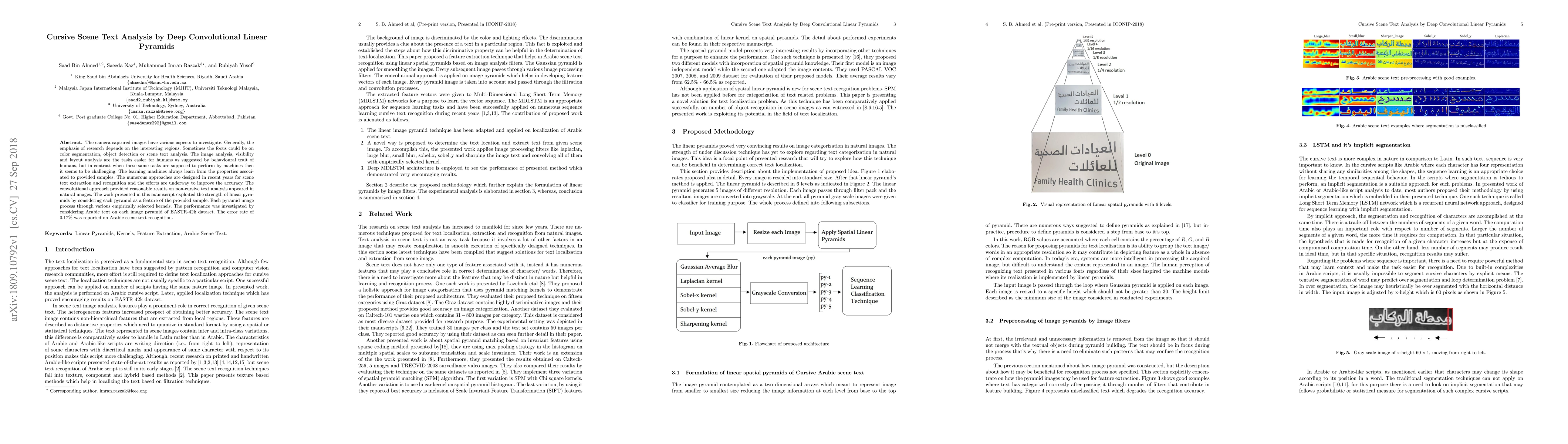 This paper proposes a method for analyzing cursive scene text using deep convolutional linear pyramids, achieving a 0.17% error rate on Arabic text recognition in the EASTR-42k dataset. The approach leverages linear pyramids processed through selected kernels to enhance text extraction accuracy.