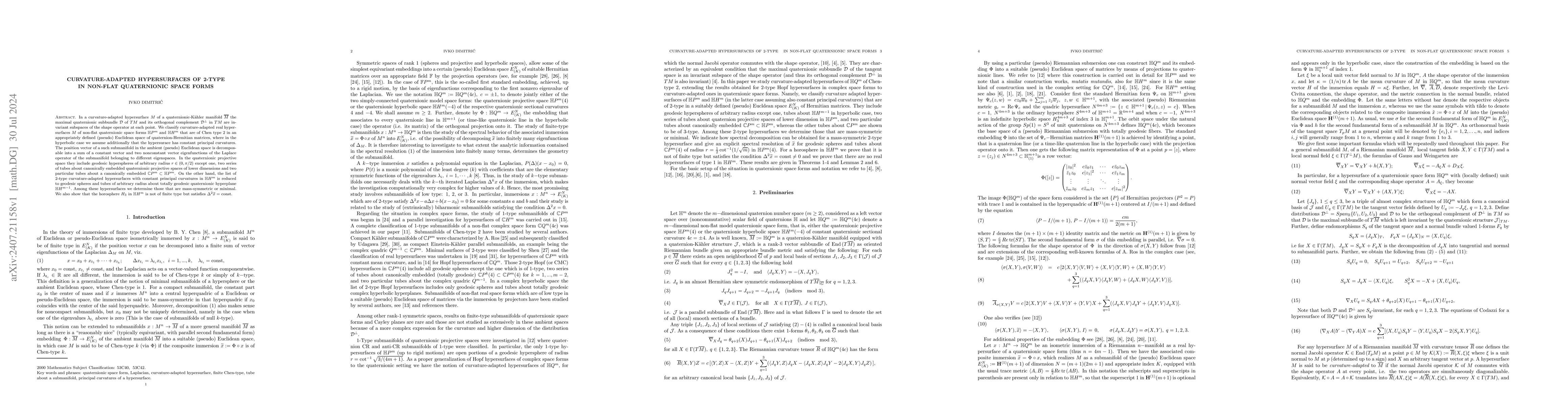 This paper classifies curvature-adapted hypersurfaces of Chen type 2 in non-flat quaternionic space forms, identifying their geometric structures and properties, and determines mass-symmetric or minimal hypersurfaces, while noting that the horosphere in hyperbolic space does not exhibit finite type but satisfies a specific differential condition.