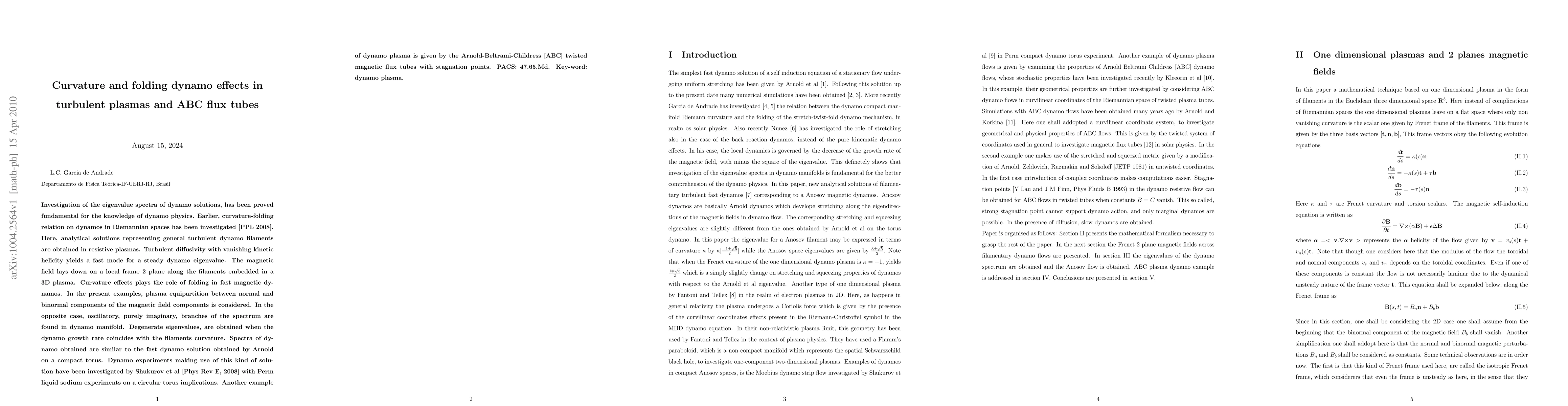 This paper investigates the eigenvalue spectra of dynamo solutions in turbulent plasmas, focusing on the effects of curvature and folding in fast magnetic dynamos. Analytical solutions for turbulent dynamo filaments in resistive plasmas show that vanishing kinetic helicity leads to a fast mode steady dynamo eigenvalue, with magnetic fields lying on a local 2D plane. The study also explores the implications of ABC flux tubes in dynamo experiments, revealing similarities to Arnold's fast dynamo solution.