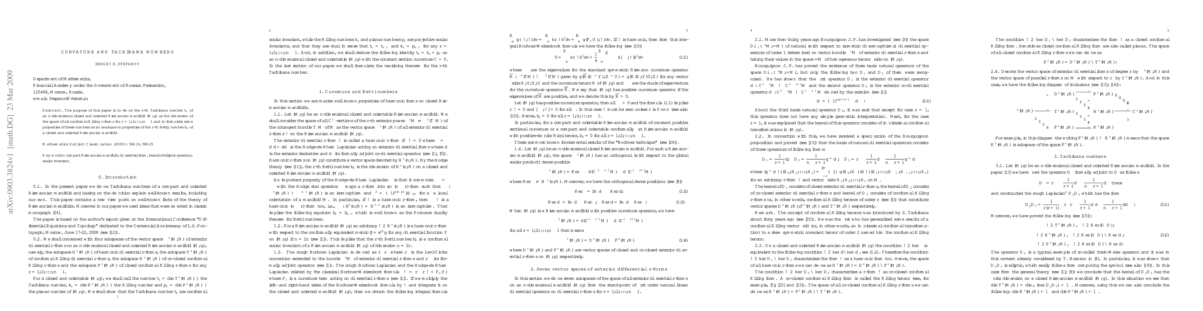 The purpose of this paper is to define the r-th Tachibana number t(r) of an n-dimentional closed and oriented Riemannian manifold (M,g) as the dimension of the space of all conformal Killing r-forms for r=1,2,...,n-1 and to formulate some properties of these numbers as an analogue to properties of the r-th Betty number b(r) of a closed and oriented Riemannian manifold.
