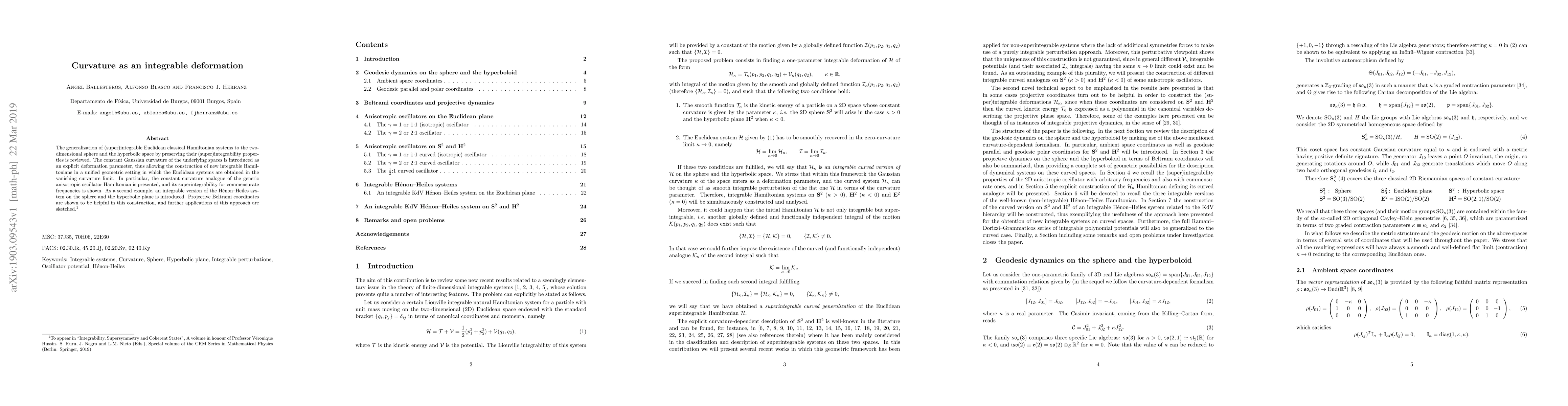 The generalization of (super)integrable Euclidean classical Hamiltonian systems to the two-dimensional sphere and the hyperbolic space by preserving their (super)integrability properties is reviewed. The constant Gaussian curvature of the underlying spaces is introduced as an explicit deformation parameter, thus allowing the construction of new integrable Hamiltonians in a unified geometric setting in which the Euclidean systems are obtained in the vanishing curvature limit. In particular, the constant curvature analogue of the generic anisotropic oscillator Hamiltonian is presented, and its superintegrability for commensurate frequencies is shown. As a second example, an integrable version of the H\'enon-Heiles system on the sphere and the hyperbolic plane is introduced. Projective Beltrami coordinates are shown to be helpful in this construction, and further applications of this approach are sketched