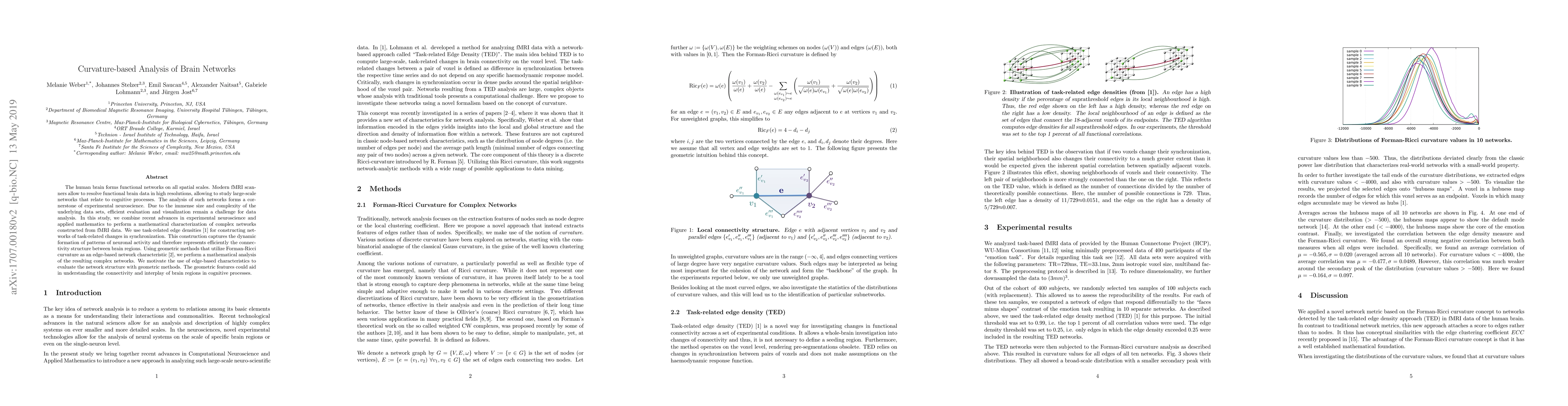 This paper combines neuroscience and applied mathematics to analyze brain networks from fMRI data using task-related edge densities and Forman-Ricci curvature. The study aims to provide a mathematical characterization of complex networks, potentially aiding in understanding brain connectivity and cognitive processes.