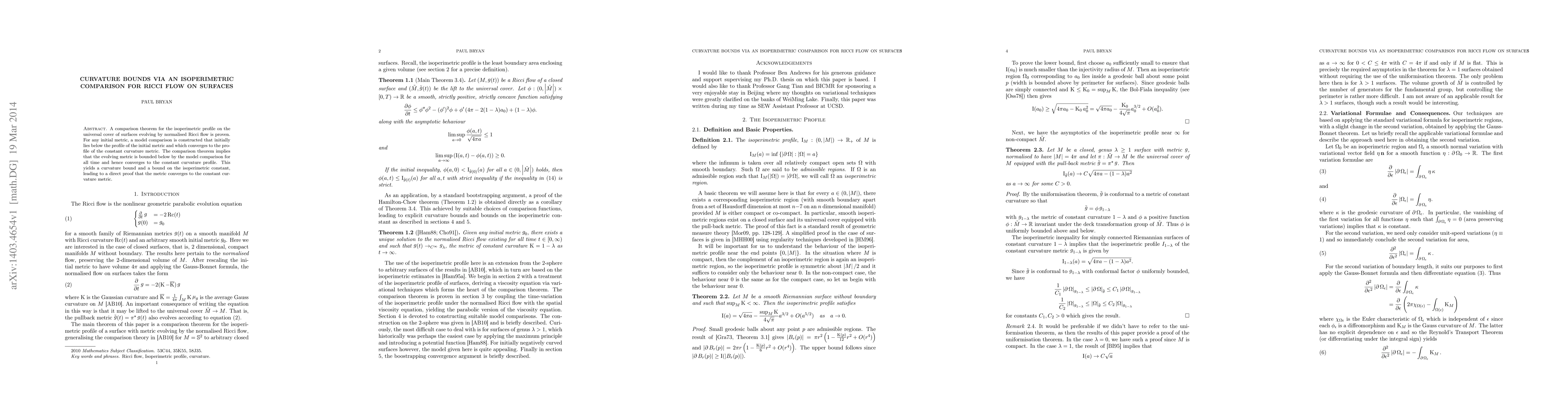 This paper proves a comparison theorem for the isoperimetric profile during normalized Ricci flow on surfaces, showing that the evolving metric is bounded below by a model comparison converging to a constant curvature metric. This leads to curvature bounds and convergence to the constant curvature profile.