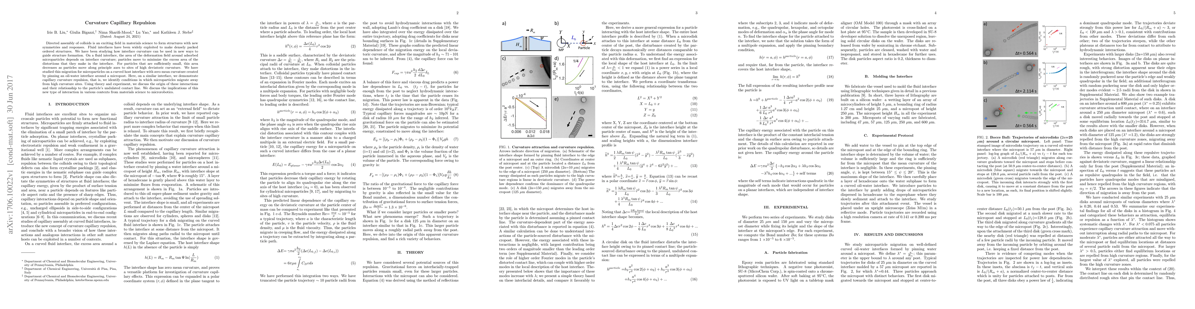 Directed assembly of colloids is an exciting field in materials science to form structures with new symmetries and responses. Fluid interfaces have been widely exploited to make densely packed ordered structures. We have been studying how interface curvature can be used in new ways to guide structure formation. On a fluid interface, the area of the deformation field around adsorbed microparticles depends on interface curvature; particles move to minimize the excess area of the distortions that they make in the interface. For particles that are sufficiently small, this area decreases as particles move along principle axes to sites of high deviatoric curvature. We have studied this migration for microparticles on a curved host interface with zero mean curvature created by pinning an oil-water interface around a micropost. Here, on a similar interface, we demonstrate capillary curvature repulsion, that is, we identify conditions in which microparticles migrate away from high curvature sites. Using theory and experiment, we discuss the origin of these interactions and their relationship to the particle's undulated contact line. We discuss the implications of this new type of interaction in various contexts from materials science to microrobotics.