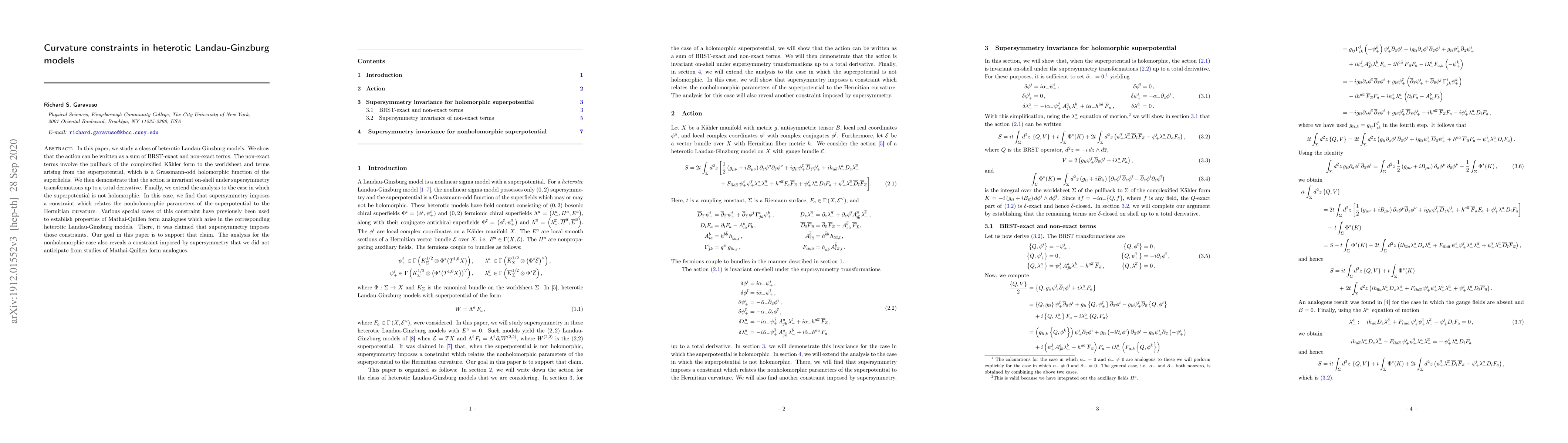 This paper investigates heterotic Landau-Ginzburg models and shows that their action comprises BRST-exact and non-exact terms linked to the complexified Kähler form and superpotential. It demonstrates that the action remains invariant under supersymmetry up to a total derivative, and reveals a novel curvature constraint when the superpotential is nonholomorphic, supporting claims about constraints imposed by supersymmetry in related models.