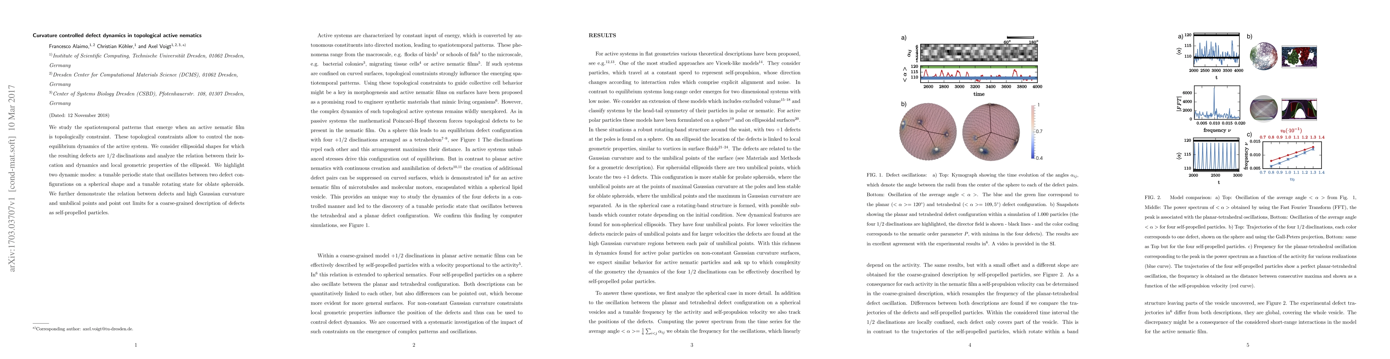 We study the spatiotemporal patterns that emerge when an active nematic film is topologically constraint. These topological constraints allow to control the non-equilibrium dynamics of the active system. We consider ellipsoidal shapes for which the resulting defects are 1/2 disclinations and analyze the relation between their location and dynamics and local geometric properties of the ellipsoid. We highlight two dynamic modes: a tunable periodic state that oscillates between two defect configurations on a spherical shape and a tunable rotating state for oblate spheroids. We further demonstrate the relation between defects and high Gaussian curvature and umbilical points and point out limits for a coarse-grained description of defects as self-propelled particles.