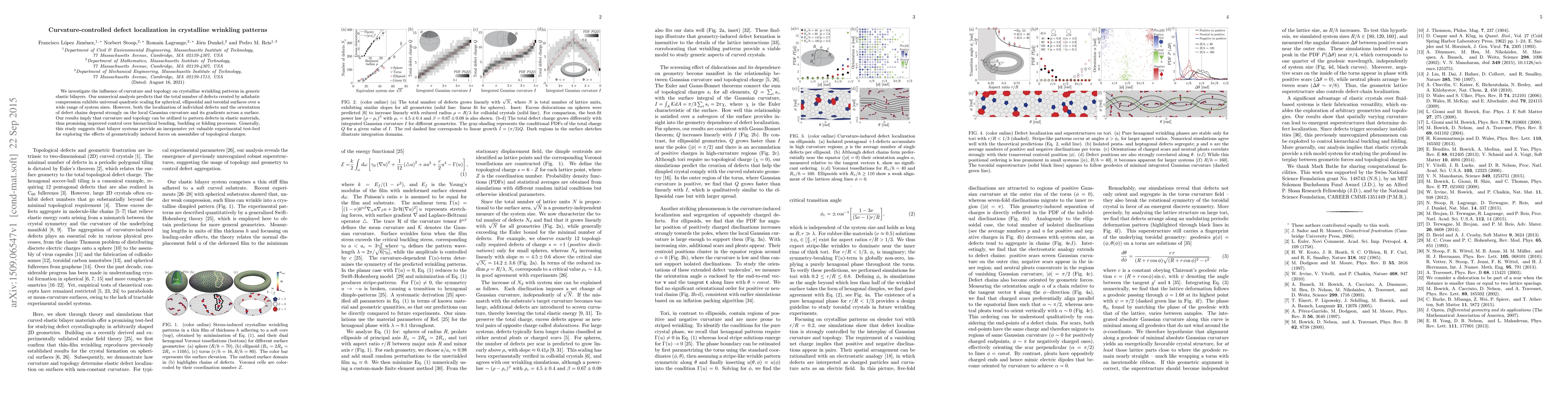 This research explores how curvature and topology affect crystalline wrinkling in elastic bilayers, revealing a universal quadratic scaling of defects under compression, with defect localization and orientation strongly influenced by local Gaussian curvature and its gradients. The findings suggest that curvature can be used to pattern defects, offering improved control over material folding processes.