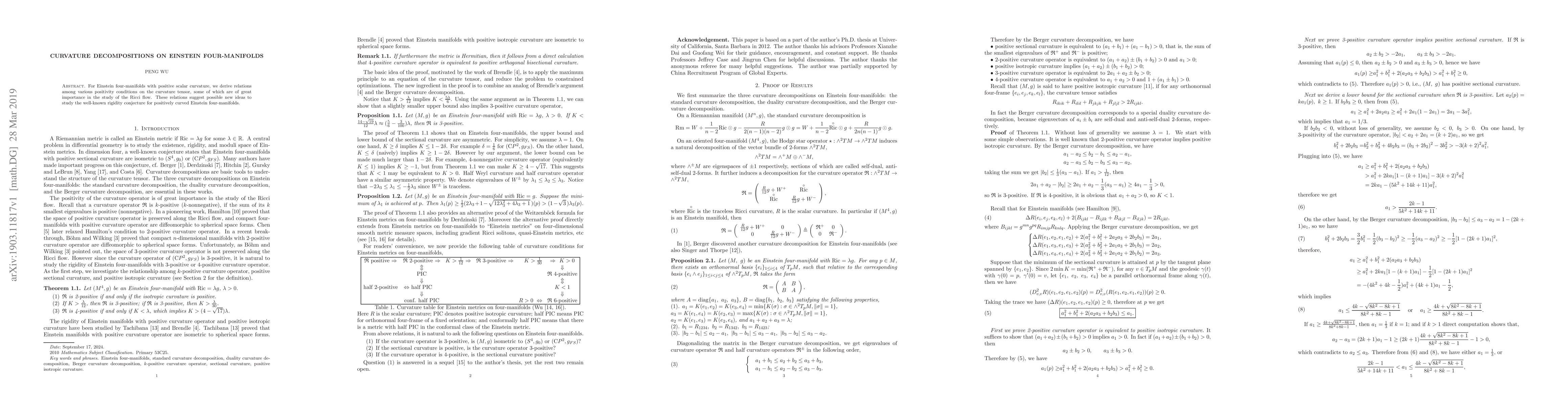 This paper explores curvature decompositions on Einstein four-manifolds with positive scalar curvature, deriving relations among various curvature positivity conditions crucial for Ricci flow studies. It proposes new ideas to tackle the rigidity conjecture for such manifolds.