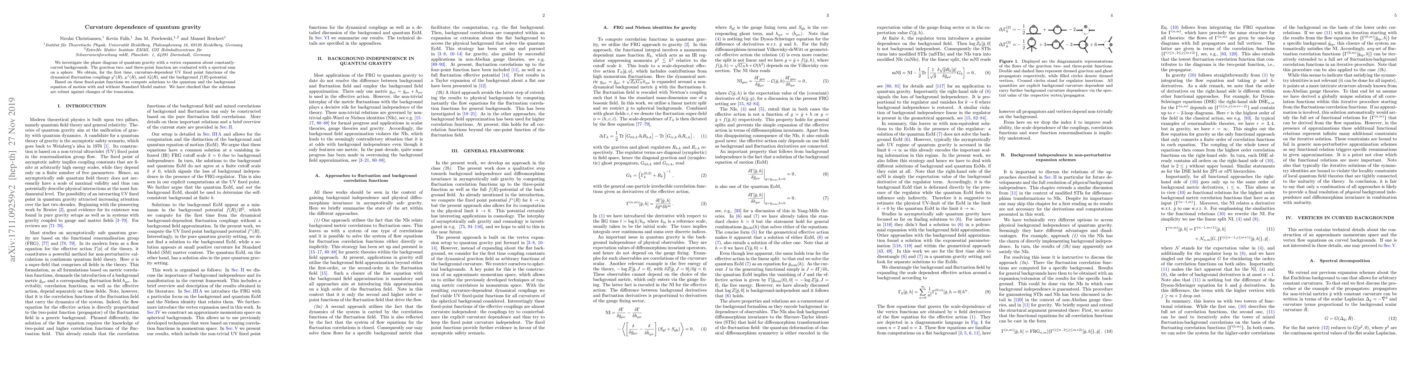 We investigate the phase diagram of quantum gravity with a vertex expansion about constantly-curved backgrounds. The graviton two- and three-point function are evaluated with a spectral sum on a sphere. We obtain, for the first time, curvature-dependent UV fixed point functions of the dynamical fluctuation couplings $g^*(R)$, $\mu^*(R)$, and $\lambda_3^*(R)$, and the background $f(R)$-potential. Based on these fixed point functions we compute solutions to the quantum and the background equation of motion with and without Standard Model matter. We have checked that the solutions are robust against changes of the truncation.
