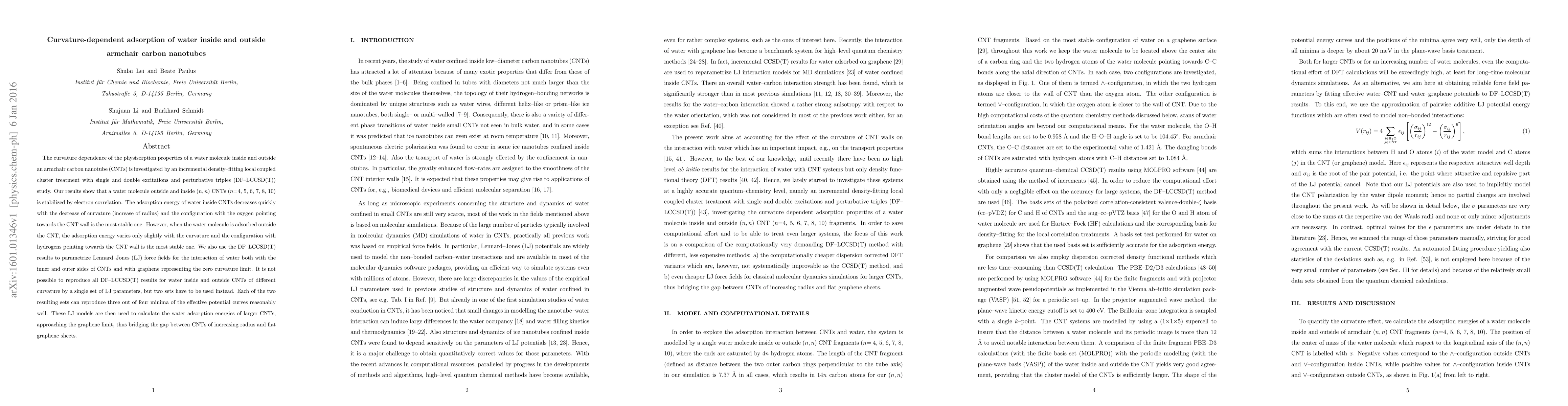 The curvature dependence of the physisorption properties of a water molecule inside and outside an armchair carbon nanotube (CNTs) is investigated by an incremental density-fitting local coupled cluster treatment with single and double excitations and perturbative triples (DF-LCCSD(T)) study. Our results show that a water molecule outside and inside (n, n) CNTs (n=4, 5, 6, 7, 8, 10) is stabilized by electron correlation. The adsorption energy of water inside CNTs decreases quickly with the decrease of curvature (increase of radius) and the configuration with the oxygen pointing towards the CNT wall is the most stable one. However, when the water molecule is adsorbed outside the CNT, the adsorption energy varies only slightly with the curvature and the configuration with hydrogens pointing towards the CNT wall is the most stable one. We also use the DF-LCCSD(T) results to parametrize Lennard-Jones (LJ) force fields for the interaction of water both with the inner and outer sides of CNTs and with graphene representing the zero curvature limit. It is not possible to reproduce all DF-LCCSD(T) results for water inside and outside CNTs of different curvature by a single set of LJ parameters, but two sets have to be used instead. Each of the two resulting sets can reproduce three out of four minima of the effective potential curves reasonably well. These LJ models are then used to calculate the water adsorption energies of larger CNTs, approaching the graphene limit, thus bridging the gap between CNTs of increasing radius and flat graphene sheets.