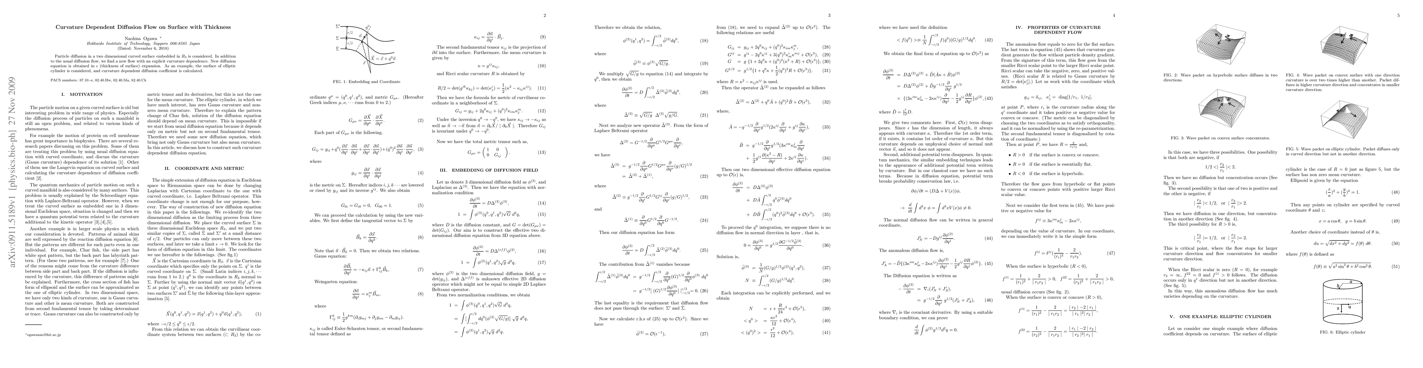 Particle diffusion in a two dimensional curved surface embedded in $R_3$ is considered. In addition to the usual diffusion flow, we find a new flow with an explicit curvature dependence. New diffusion equation is obtained in $\epsilon$ (thickness of surface) expansion. As an example, the surface of elliptic cylinder is considered, and curvature dependent diffusion coefficient is calculated.