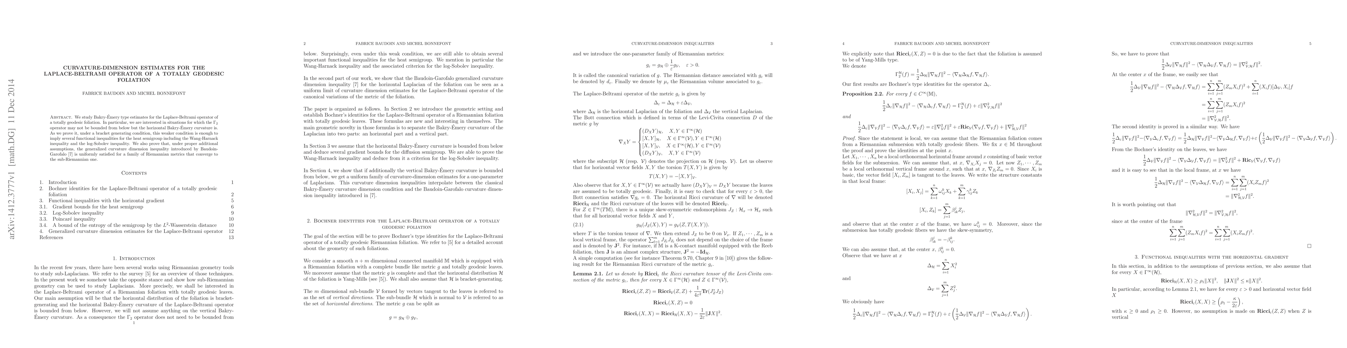 This paper investigates Bakry-Eméry curvature-dimension estimates for the Laplace-Beltrami operator in the context of totally geodesic foliations, demonstrating that horizontal Bakry-Eméry curvature, despite $\Gamma_2$ operator not being bounded, still leads to significant functional inequalities such as the Wang-Harnack and log-Sobolev inequalities. Additionally, it shows uniform satisfaction of the Baudoin-Garofalo curvature dimension inequality under certain convergence conditions.