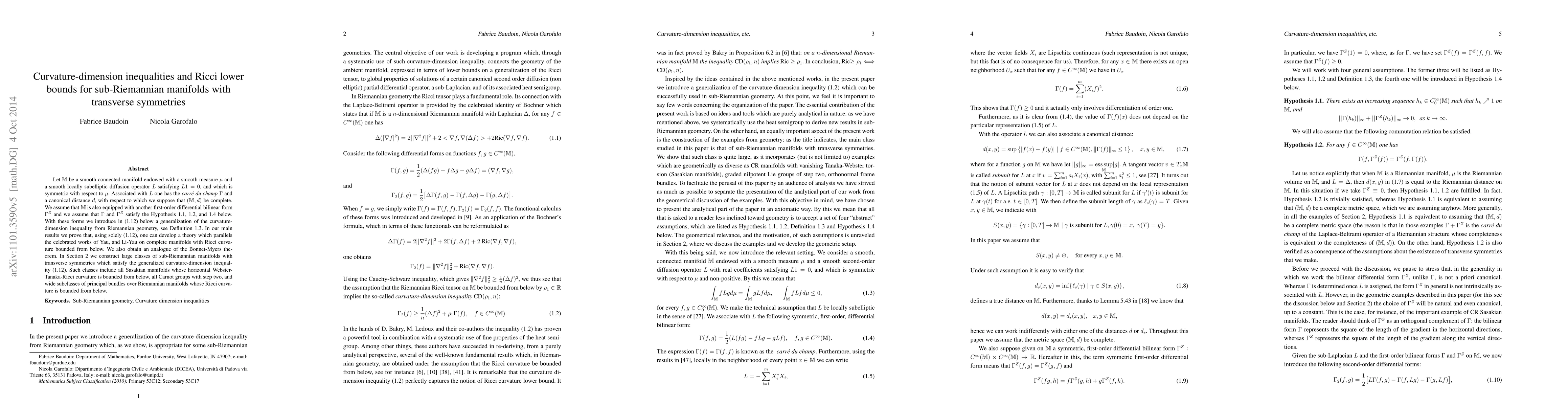 Let $\M$ be a smooth connected manifold endowed with a smooth measure $\mu$ and a smooth locally subelliptic diffusion operator $L$ satisfying $L1=0$, and which is symmetric with respect to $\mu$. Associated with $L$ one has \textit{le carr\'e du champ} $\Gamma$ and a canonical distance $d$, with respect to which we suppose that $(M,d)$ be complete. We assume that $\M$ is also equipped with another first-order differential bilinear form $\Gamma^Z$ and we assume that $\Gamma$ and $\Gamma^Z$ satisfy the Hypothesis below. With these forms we introduce in \eqref{cdi} below a generalization of the curvature-dimension inequality from Riemannian geometry, see Definition \ref{D:cdi}. In our main results we prove that, using solely \eqref{cdi}, one can develop a theory which parallels the celebrated works of Yau, and Li-Yau on complete manifolds with Ricci bounded from below. We also obtain an analogue of the Bonnet-Myers theorem. In Section \ref{S:appendix} we construct large classes of sub-Riemannian manifolds with transverse symmetries which satisfy the generalized curvature-dimension inequality \eqref{cdi}. Such classes include all Sasakian manifolds whose horizontal Webster-Tanaka-Ricci curvature is bounded from below, all Carnot groups with step two, and wide subclasses of principal bundles over Riemannian manifolds whose Ricci curvature is bounded from below.