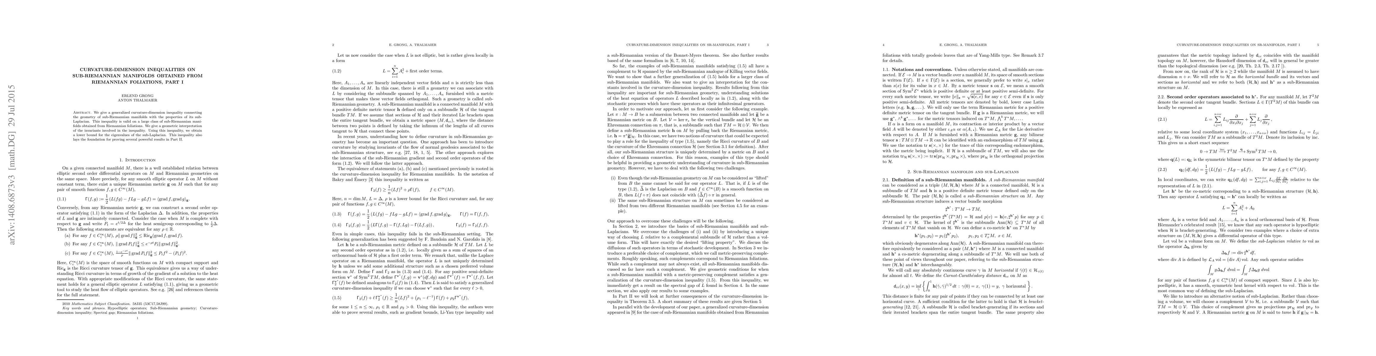 We give a generalized curvature-dimension inequality connecting the geometry of sub-Riemannian manifolds with the properties of its sub-Laplacian. This inequality is valid on a large class of sub-Riemannian manifolds obtained from Riemannian foliations. We give a geometric interpretation of the invariants involved in the inequality. Using this inequality, we obtain a lower bound for the eigenvalues of the sub-Laplacian. This inequality also lays the foundation for proving several powerful results in Part~II.