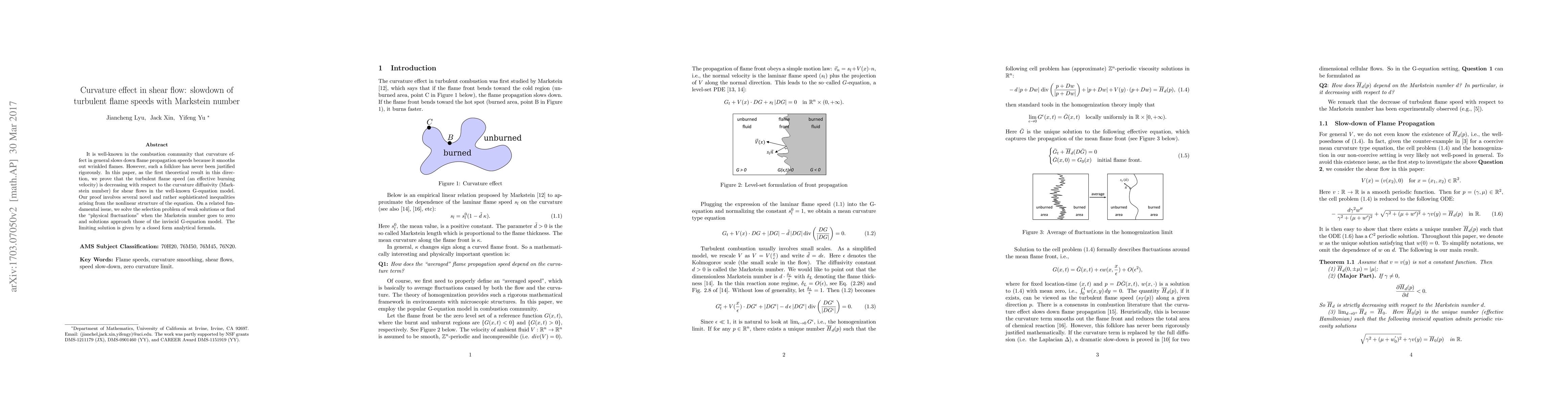 It is well known in the combustion community that curvature effect in general slows down flame propagation speeds because it smooths out wrinkled flames. However, such a folklore has never been justified rigorously. In this paper, as the first theoretical result in this direction, we prove that the turbulent flame speed (an effective burning velocity) is decreasing with respect to the curvature diffusivity (Markstein number) for shear flows in the well known G-equation model. Our proof involves several novel and rather sophisticated inequalities arising from the nonlinear structure of the equation. On a related fundamental issue, we solve the selection problem of weak solutions or find the "physical fluctuations" when the Markstein number goes to zero and solutions approach those of the inviscid G-equation model. The limiting solution is given by a closed form analytical formula.