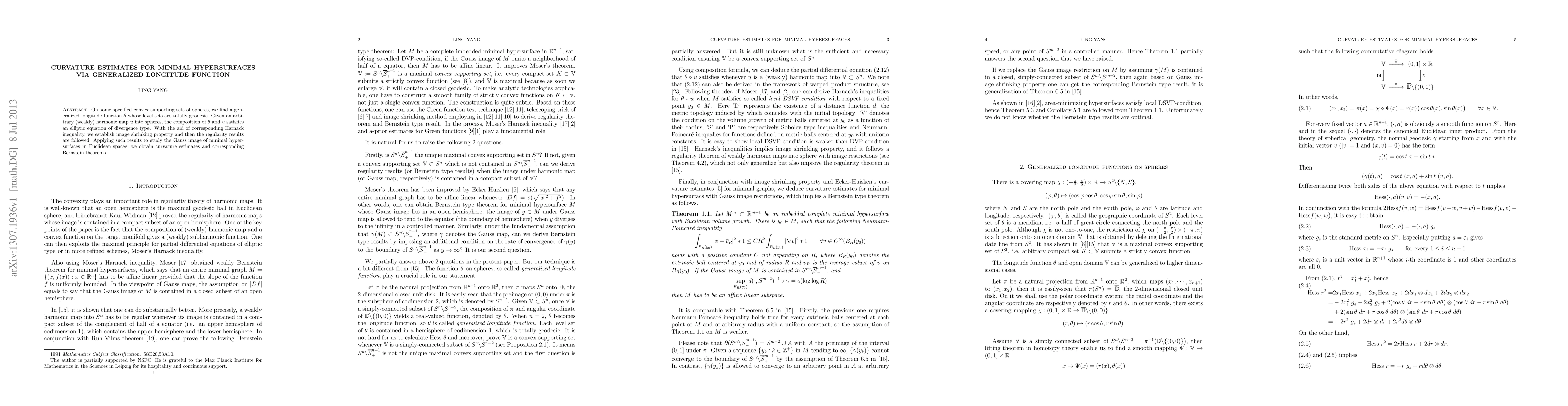 On some specified convex supporting sets of spheres, we find a generalized longitude function whose level sets are totally geodesic. Given an arbitrary (weakly) harmonic map into spheres, the composition of the generalized longitude function and harmonic map satisfies an elliptic equation of divergence type. With the aid of corresponding Harnack inequality, we establish image shrinking property and then the regularity results are followed. Applying such results to study the Gauss image of minimal hypersurfaces in Euclidean spaces, we obtain curvature estimates and corresponding Bernstein theorems.