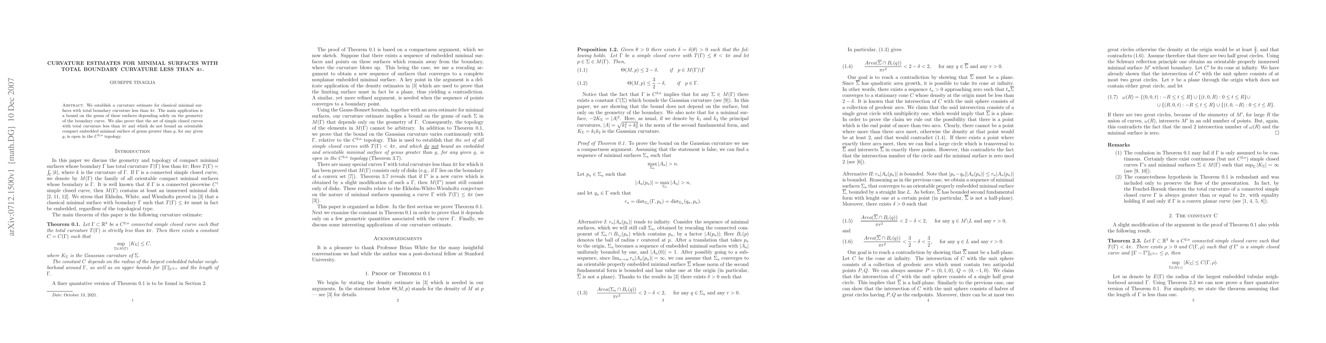 This paper establishes a curvature estimate for minimal surfaces with boundary curvature less than 4π, leading to a bound on the genus of these surfaces based on boundary geometry. It also proves that the set of simple closed curves with total curvature under 4π not bounding high-genus minimal surfaces is open in the C²ₐ topology.