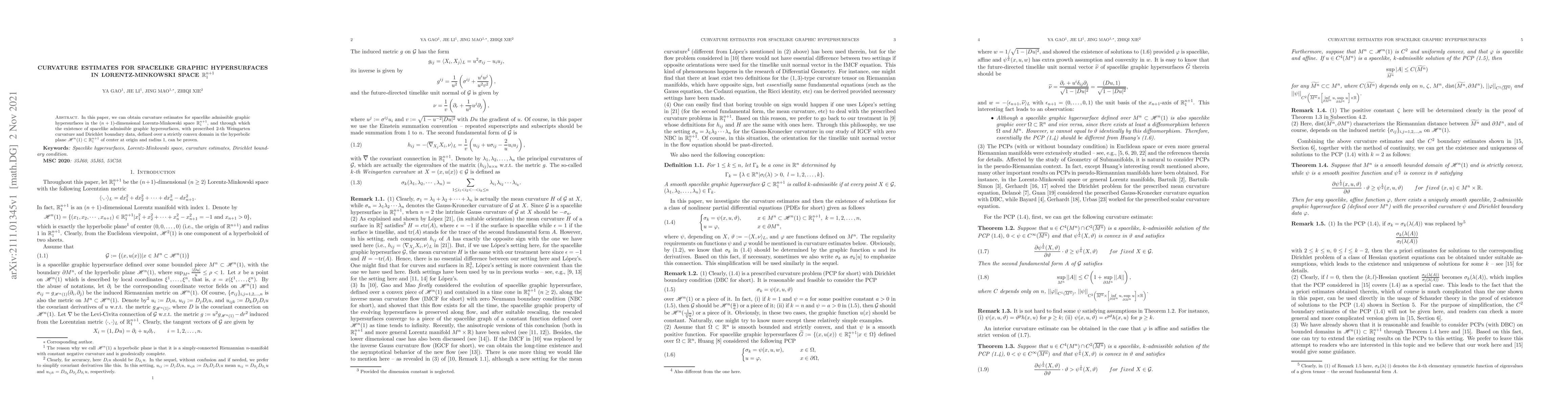 In this paper, we can obtain curvature estimates for spacelike admissible graphic hypersurfaces in the $(n+1)$-dimensional Lorentz-Minkowski space $\mathbb{R}^{n+1}_{1}$, and through which the existence of spacelike admissible graphic hypersurfaces, with prescribed $2$-th Weingarten curvature and Dirichlet boundary data, defined over a strictly convex domain in the hyperbolic plane $\mathscr{H}^{n}(1)\subset\mathbb{R}^{n+1}_{1}$ of center at origin and radius $1$, can be proven.