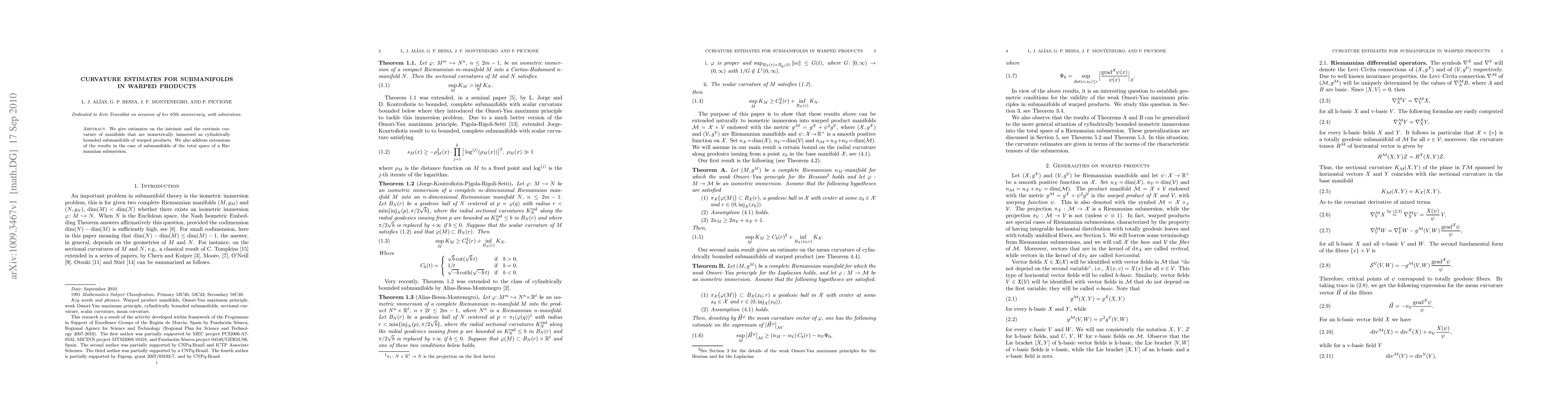 This paper provides estimates for both the intrinsic and extrinsic curvatures of submanifolds embedded in warped products, focusing on cylindrically bounded immersions. It also extends these estimates to submanifolds in the total space of a Riemannian submersion.