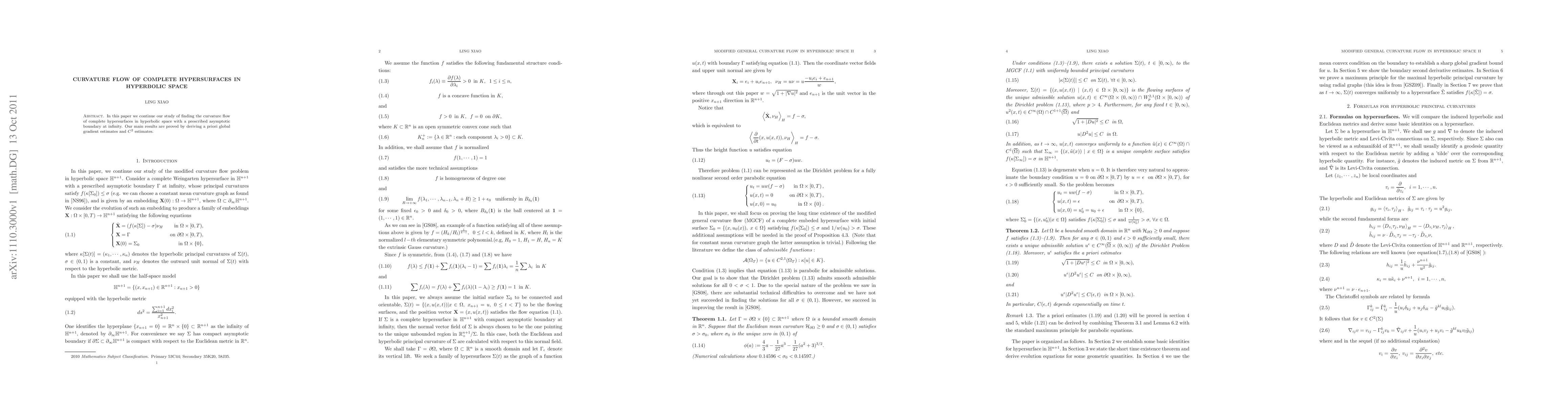 Summary: This paper investigates the curvature flow of complete hypersurfaces in hyperbolic space with an asymptotic boundary at infinity. The authors establish global gradient and C^2 estimates to support their findings.