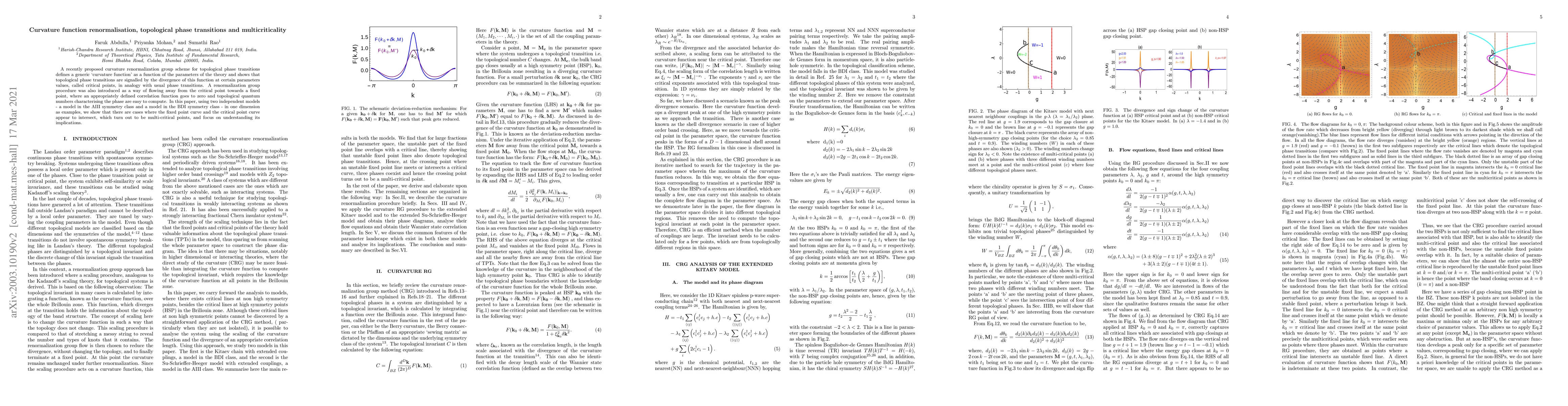 This paper explores a curvature renormalization group scheme for topological phase transitions, demonstrating that critical points are marked by divergences in a curvature function. It investigates intersections between fixed and critical point curves in two 1D models, revealing multicritical points and discussing their implications for understanding topological phases.