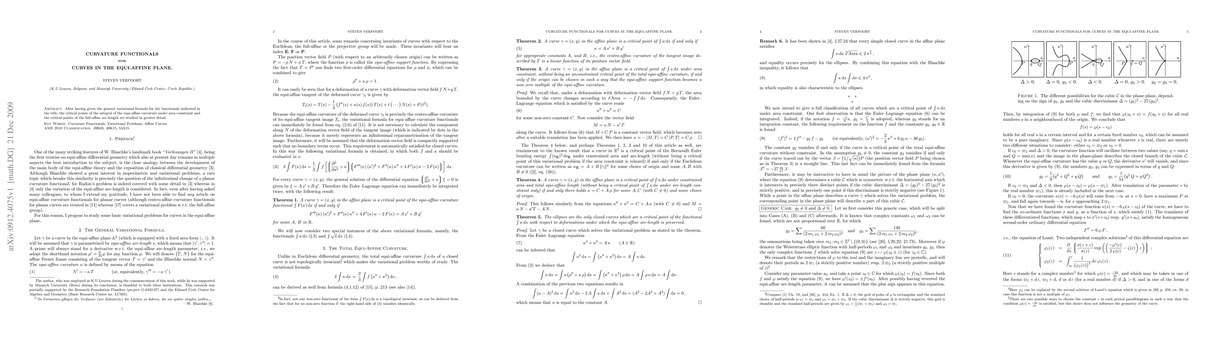 After having given the general variational formula for the functionals indicated in the title, the critical points of the integral of the equi-affine curvature under area constraint and the critical points of the full-affine arc-length are studied in greater detail.