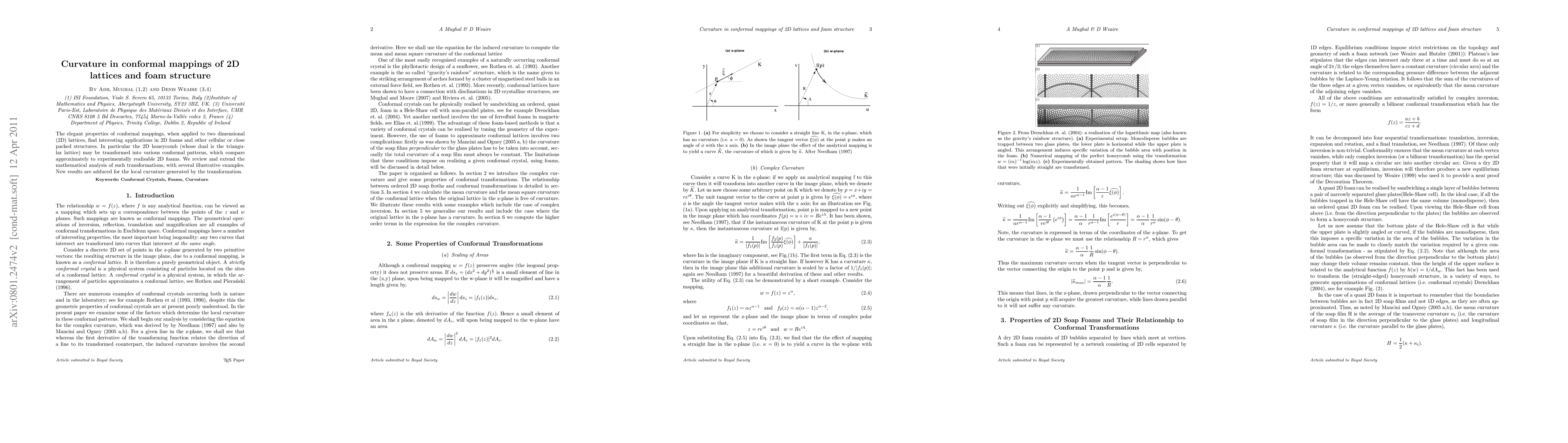 The elegant properties of conformal mappings, when applied to two dimensional (2D) lattices, find interesting applications in 2D foams and other cellular or close packed structures. In particular the 2D honeycomb (whose dual is the triangular lattice) may be transformed into various conformal patterns, which compare approximately to experimentally realisable 2D foams. We review and extend the mathematical analysis of such transformations, with several illustrative examples, and an account is given of the related work in energy minimisation problems. New results are adduced for the local curvature generated by the transformation.