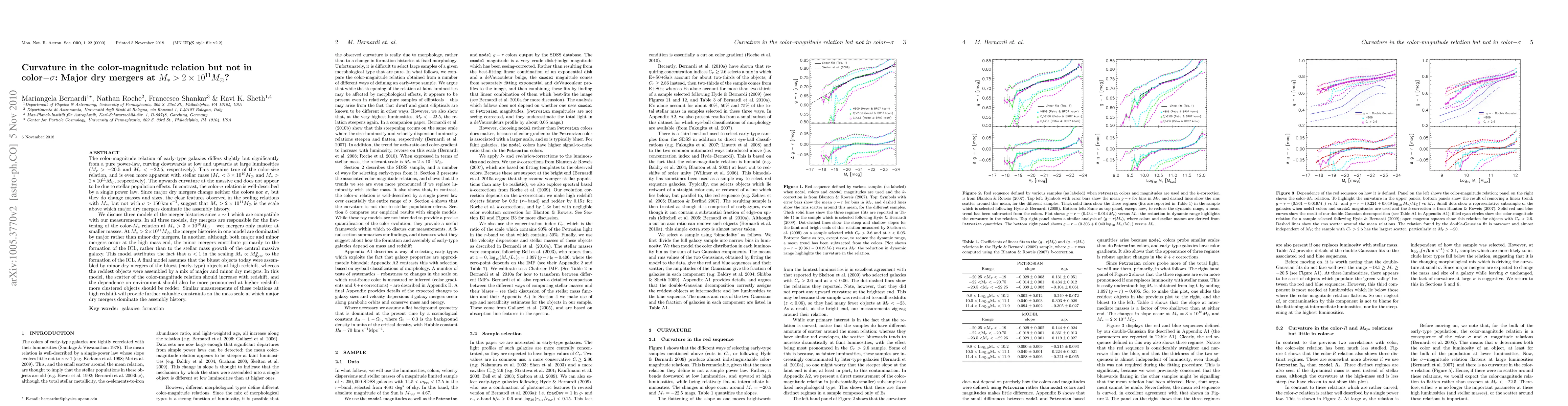 The color-magnitude relation of early-type galaxies differs slightly but significantly from a pure power-law, curving downwards at low and upwards at large luminosities (Mr>-20.5 and Mr<-22.5). This remains true of the color-size relation, and is even more apparent with stellar mass (M* < 3x10^10 Msun and M* > 2x10^11 Msun). The upwards curvature at the massive end does not appear to be due to stellar population effects. In contrast, the color-sigma relation is well-described by a single power law. Since major dry mergers change neither the colors nor sigma, but they do change masses and sizes, the clear features observed in the scaling relations with M*, but not with sigma > 150 km/s, suggest that M* > 2x10^11 Msun is the scale above which major dry mergers dominate the assembly history. We discuss three models of the merger histories since z ~ 1 which are compatible with our measurements. In all three models, dry mergers are responsible for the flattening of the color-M* relation at M* > 3x10^10 Msun - wet mergers only matter at smaller masses. At M* > 2 x 10^11 Msun, the merger histories in one model are dominated by major rather than minor dry mergers, as suggested by the axis ratio and color gradient trends. In another, although both major and minor mergers occur at the high mass end, the minor mergers contribute primarily to the formation of the ICL, rather than to the mass growth of the central massive galaxy. A final model assumes that the reddest objects were assembled by a mix of major and minor dry mergers.