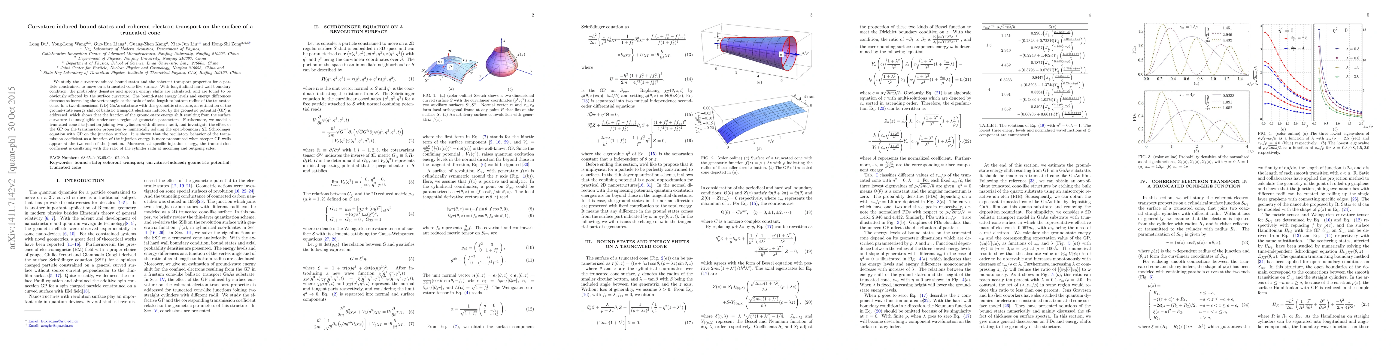 We study the curvature-induced bound states and the coherent transport properties for a particle constrained to move on a truncated cone-like surface. With longitudinal hard wall boundary condition, the probability densities and spectra energy shifts are calculated, and are found to be obviously affected by the surface curvature. The bound-state energy levels and energy differences decrease as increasing the vertex angle or the ratio of axial length to bottom radius of the truncated cone. In a two-dimensional (2D) GaAs substrate with this geometric structure, an estimation of the ground-state energy shift of ballistic transport electrons induced by the geometric potential (GP) is addressed, which shows that the fraction of the ground-state energy shift resulting from the surface curvature is unnegligible under some region of geometric parameters. Furthermore, we model a truncated cone-like junction joining two cylinders with different radii, and investigate the effect of the GP on the transmission properties by numerically solving the open-boundary 2D Schr\"odinger equation with GP on the junction surface. It is shown that the oscillatory behavior of the transmission coefficient as a function of the injection energy is more pronounced when steeper GP wells appear at the two ends of the junction. Moreover, at specific injection energy, the transmission coefficient is oscillating with the ratio of the cylinder radii at incoming and outgoing sides.