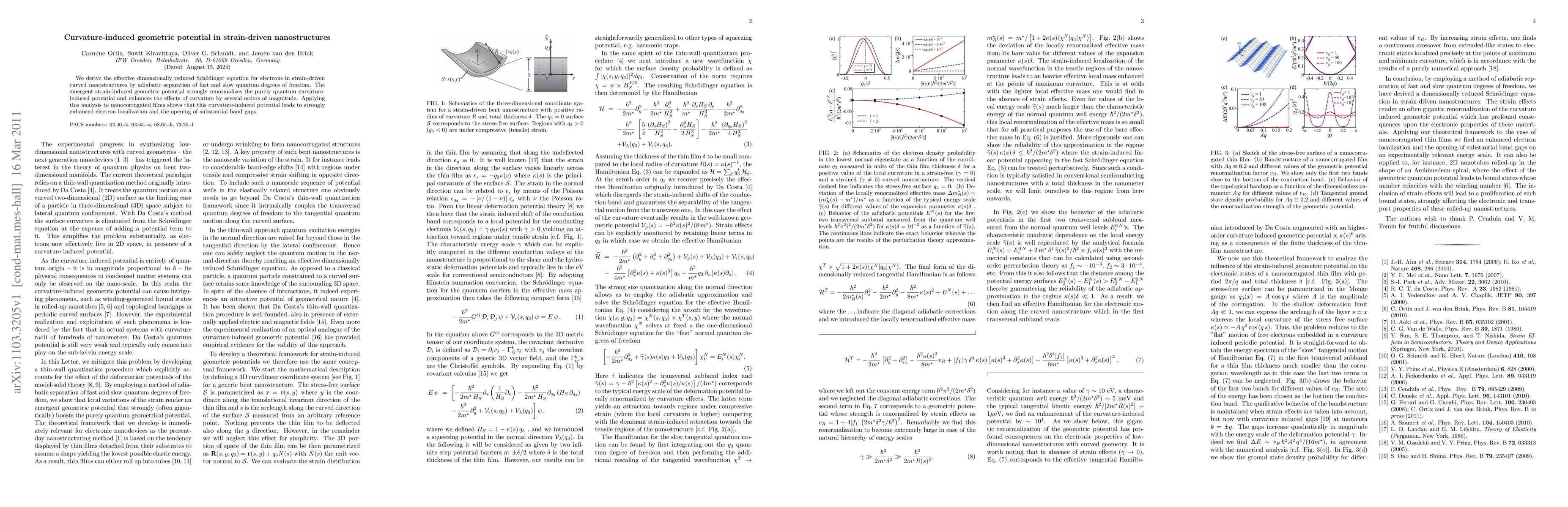 We derive the effective dimensionally reduced Sch\"odinger equation for electrons in strain-driven curved nanostructures by adiabatic separation of fast and slow quantum degrees of freedom. The emergent strain-induced geometric potential strongly renormalizes the purely quantum curvature-induced potential and enhances the effects of curvature by several orders of magnitude. Applying this analysis to nanocorrugated films shows that this curvature-induced potential leads to strongly enhanced electron localization and the opening of substantial band gaps.