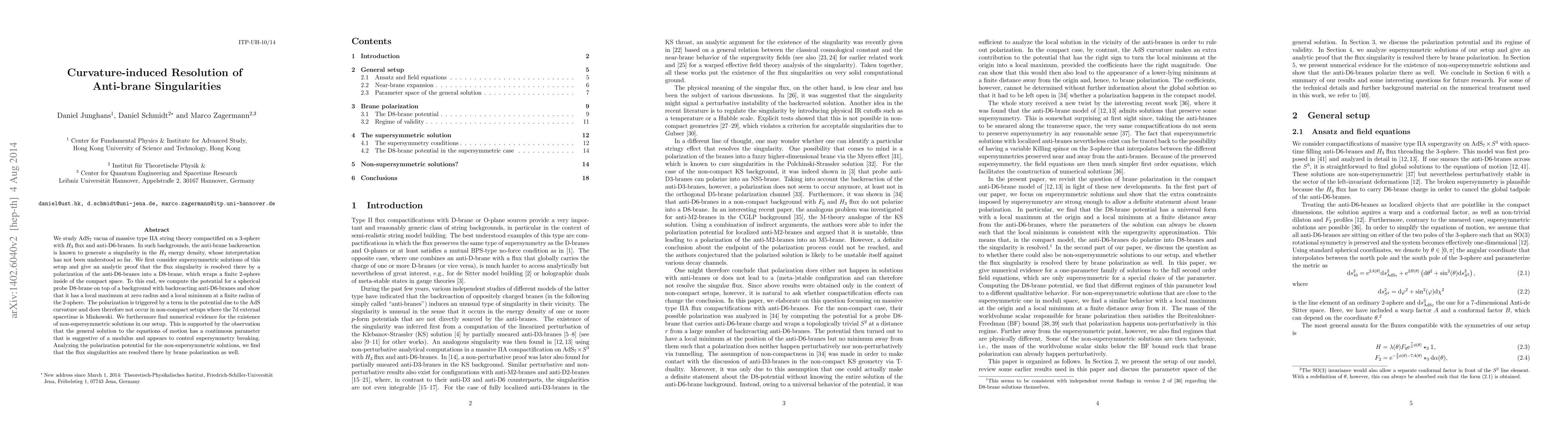 The paper presents a detailed computation of the D8-brane potential in a compactified AdS7 × S3 background with anti-D6-branes and H3 flux, demonstrating the resolution of anti-brane singularities through curvature-induced polarization.