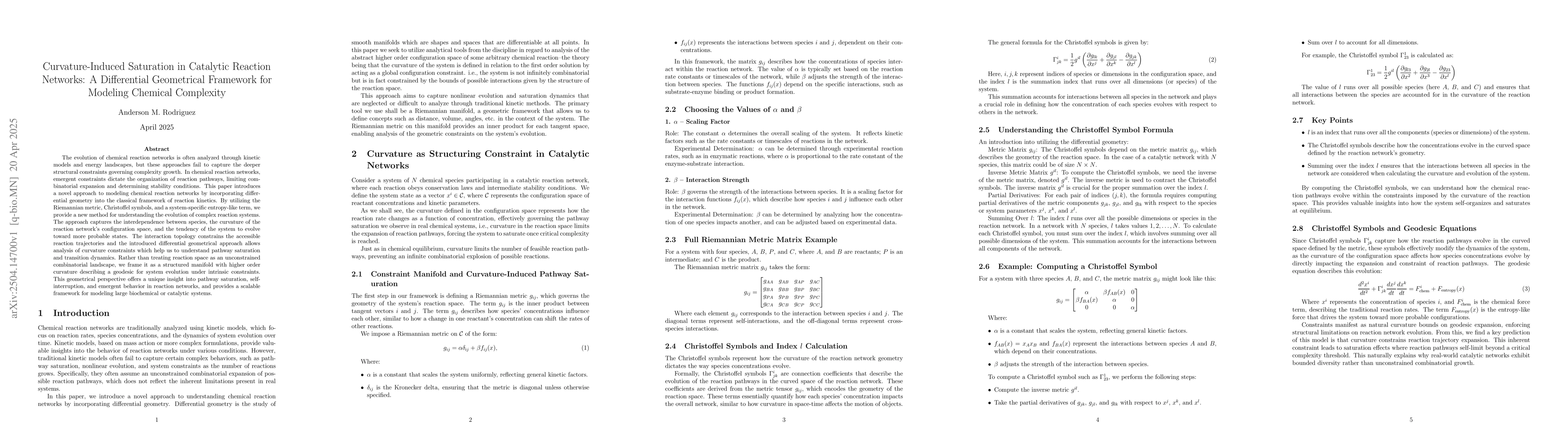 The research introduces a differential geometrical framework for modeling chemical reaction networks, utilizing Riemannian metric, Christoffel symbols, and a system-specific entropy-like term to understand the evolution of complex reaction systems.