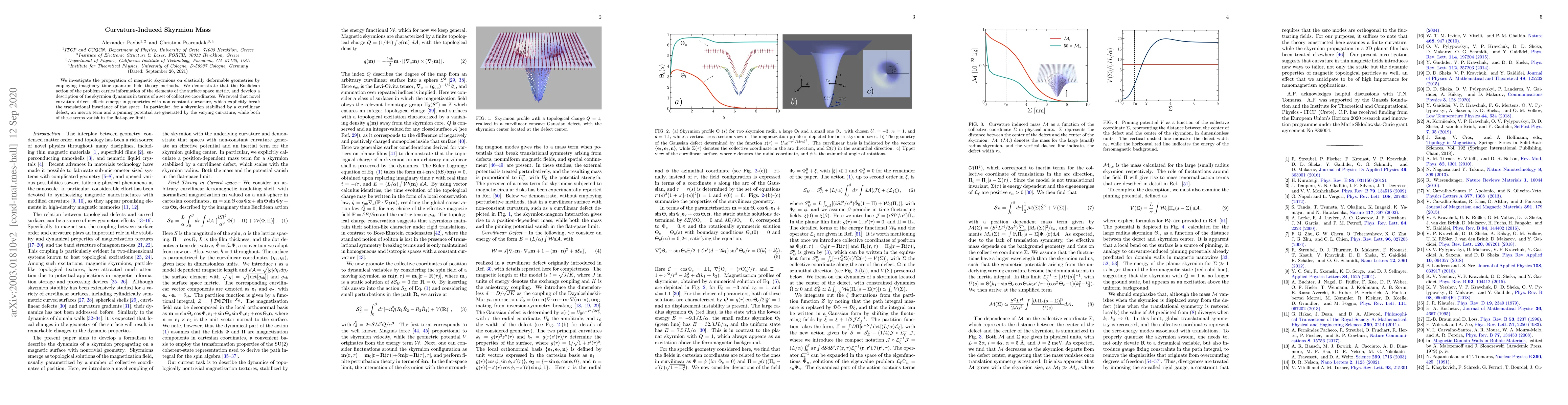 We investigate the propagation of magnetic skyrmions on elastically deformable geometries by employing imaginary time quantum field theory methods. We demonstrate that the Euclidean action of the problem carries information of the elements of the surface space metric, and develop a description of the skyrmion dynamics in terms of a set of collective coordinates. We reveal that novel curvature-driven effects emerge in geometries with non-constant curvature, which explicitly break the translational invariance of flat space. In particular, for a skyrmion stabilized by a curvilinear defect, an inertia term and a pinning potential are generated by the varying curvature, while both of these terms vanish in the flat-space limit.