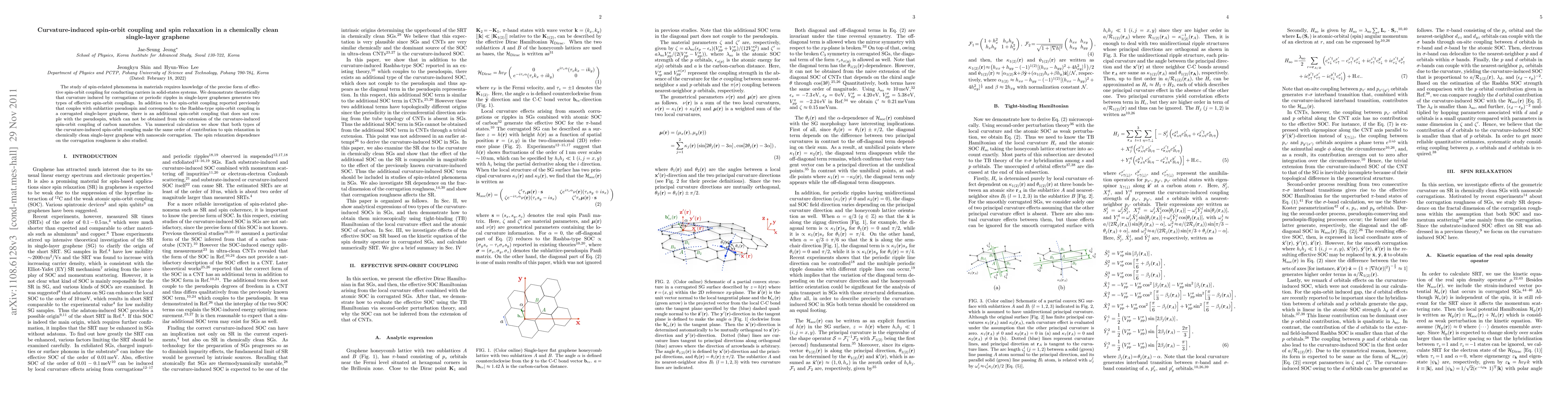 This paper theoretically demonstrates that curvature in single-layer graphene induces two types of spin-orbit coupling, including a novel coupling not linked to pseudospin. Both types contribute equally to spin relaxation in chemically clean graphene with nanoscale corrugations, and the study also examines the effect of corrugation roughness on spin relaxation.