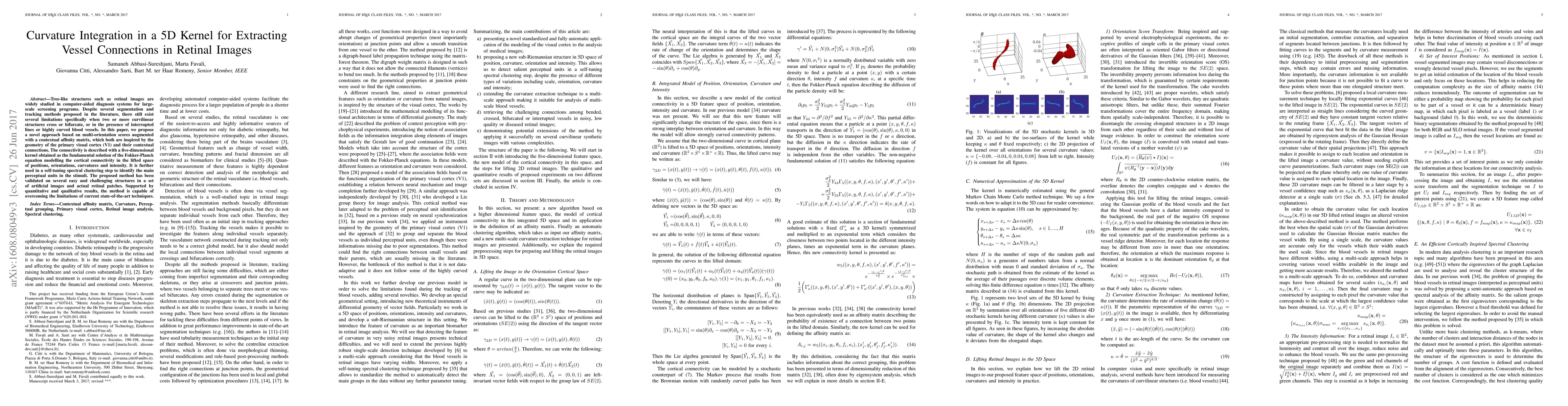 Tree-like structures such as retinal images are widely studied in computer-aided diagnosis systems for large-scale screening programs. Despite several segmentation and tracking methods proposed in the literature, there still exist several limitations specifically when two or more curvilinear structures cross or bifurcate, or in the presence of interrupted lines or highly curved blood vessels. In this paper, we propose a novel approach based on multi-orientation scores augmented with a contextual affinity matrix, which both are inspired by the geometry of the primary visual cortex (V1) and their contextual connections. The connectivity is described with a five-dimensional kernel obtained as the fundamental solution of the Fokker-Planck equation modelling the cortical connectivity in the lifted space of positions, orientations, curvatures and intensity. It is further used in a self-tuning spectral clustering step to identify the main perceptual units in the stimuli. The proposed method has been validated on several easy and challenging structures in a set of artificial images and actual retinal patches. Supported by quantitative and qualitative results, the method is capable of overcoming the limitations of current state-of-the-art techniques.