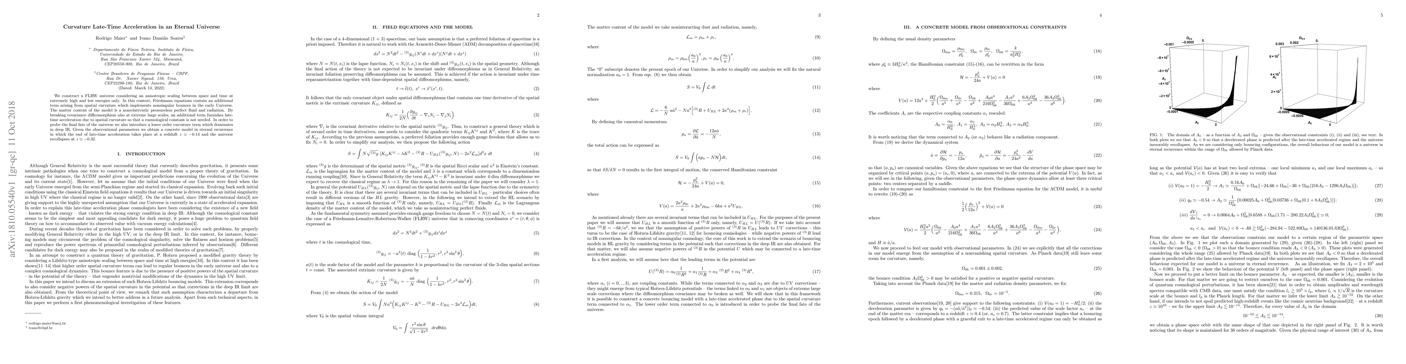 We construct a FLRW universe considering an anisotropic scaling between space and time at extremely high and low energies only. In this context, Friedmann equations contain an additional term arising from spatial curvature which implements nonsingular bounces in the early Universe. The matter content of the model is a nonrelativistic pressureless perfect fluid and radiation. By breaking covariance diffeomorphism also at extreme large scales, an additional term furnishes late-time acceleration due to spatial curvature so that a cosmological constant is not needed. In order to probe the final fate of the universe we also introduce a lower order curvature term which dominates in deep IR. Given the observational parameters we obtain a concrete model in eternal recurrence in which the end of late-time acceleration takes place at a redshift $z \simeq -0.14$ and the universe recollapses at $z\simeq - 0.32$.