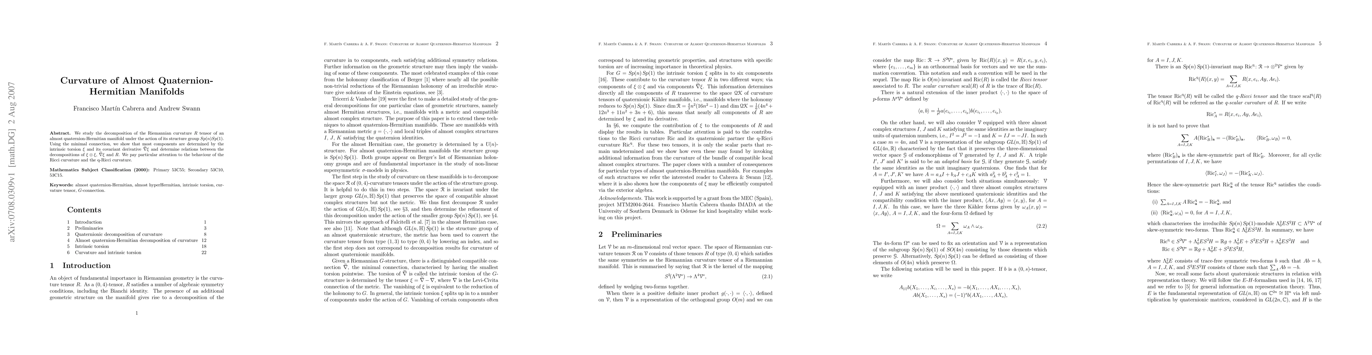 This paper decomposes the Riemannian curvature tensor of almost quaternion-Hermitian manifolds under the Sp(n)Sp(1) structure group, showing that most components are determined by intrinsic torsion and its covariant derivative. It also examines the relationships between the decompositions of torsion, its covariant derivative, and the Ricci and q-Ricci curvatures.