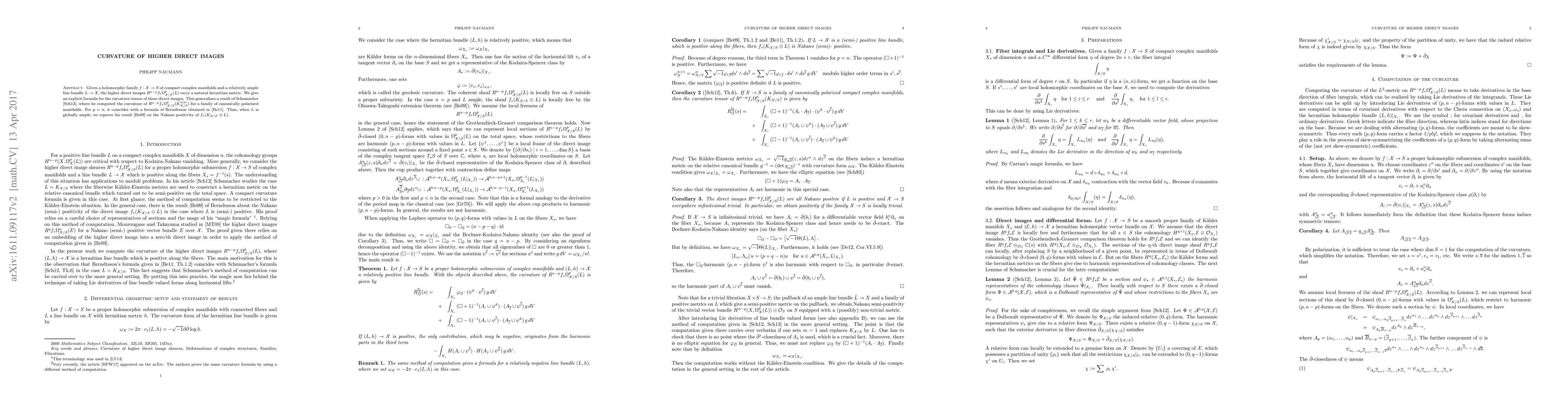 The paper presents an explicit formula for the curvature tensor of higher direct images in holomorphic families of compact complex manifolds, generalizing previous results by Schumacher and Berndtsson. It proves Nakano positivity under the condition that the line bundle is globally ample.